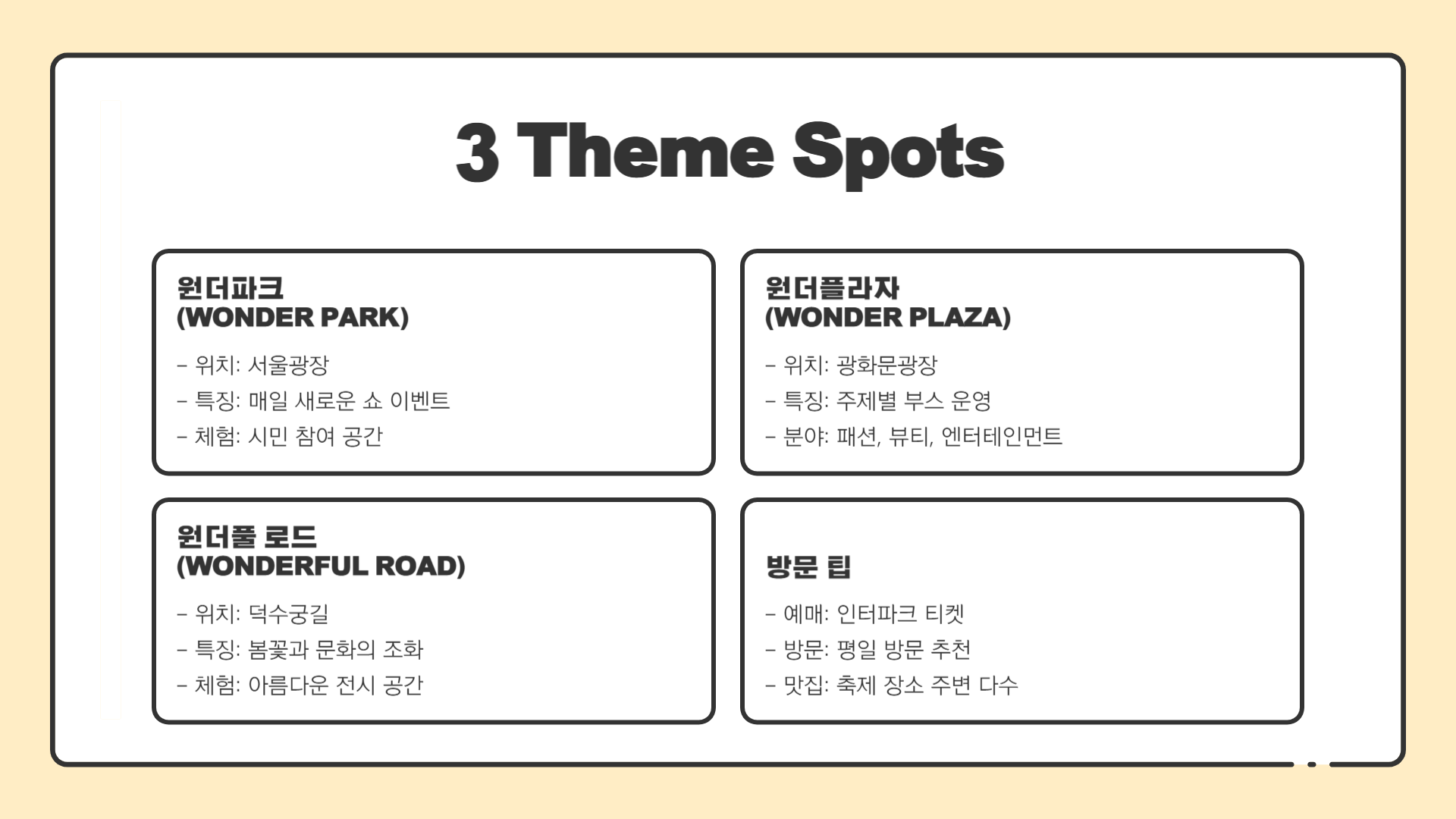 서울광장에서 열리는 원더파크는 매일매일 새로운 참여형 콘텐츠로 관람객들을 맞이합니다. VR 체험, 디지털 아트워크 제작, 전통문화 놀이존 등 다양한 부스가 마련되어 있고, 가족 단위 방문객들에게 특히 인기가 많습니다. 어린이 체험 공간도 따로 마련되어 있어서 주말 나들이로 딱이죠.