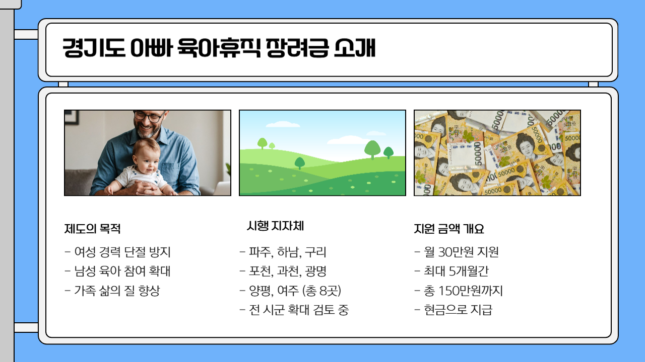 최근 몇 년간 남성의 육아휴직 사용률이 서서히 증가하고 있는 가운데, 경기도에서는 한발 더 나아가 아빠들의 적극적인 육아 참여를 유도하기 위한 실질적인 정책을 도입했습니다. 바로 ‘경기도 아빠 육아휴직 장려금’ 제도인데요. 특히 파주, 하남, 구리, 포천, 과천, 광명, 양평, 여주 등 일부 시군에서 시작된 이 제도는 앞으로 전 시군 확대도 검토 중에 있어 더욱 기대를 모으고 있습니다. 월 30만 원씩 최대 5개월간 지급되는 이 장려금은, 가정의 경제적 부담을 덜어줄 뿐만 아니라, 아빠들이 육아에 있어 실질적인 주체로 자리매김할 수 있도록 도와주는 든든한 후방 지원책이 될 수 있습니다. 오늘 포스팅에서는 경기도 아빠 육아휴직 장려금의 신청 방법, 자격 조건, 유의 사항까지 한눈에 정리해드릴게요.