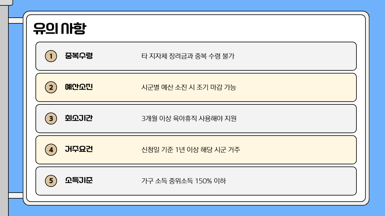 좋은 제도라고 해도, 몇 가지 주의할 점은 꼭 알고 계셔야 해요. 특히 다른 지자체 지원금과의 중복 수령은 불가능하다는 점!