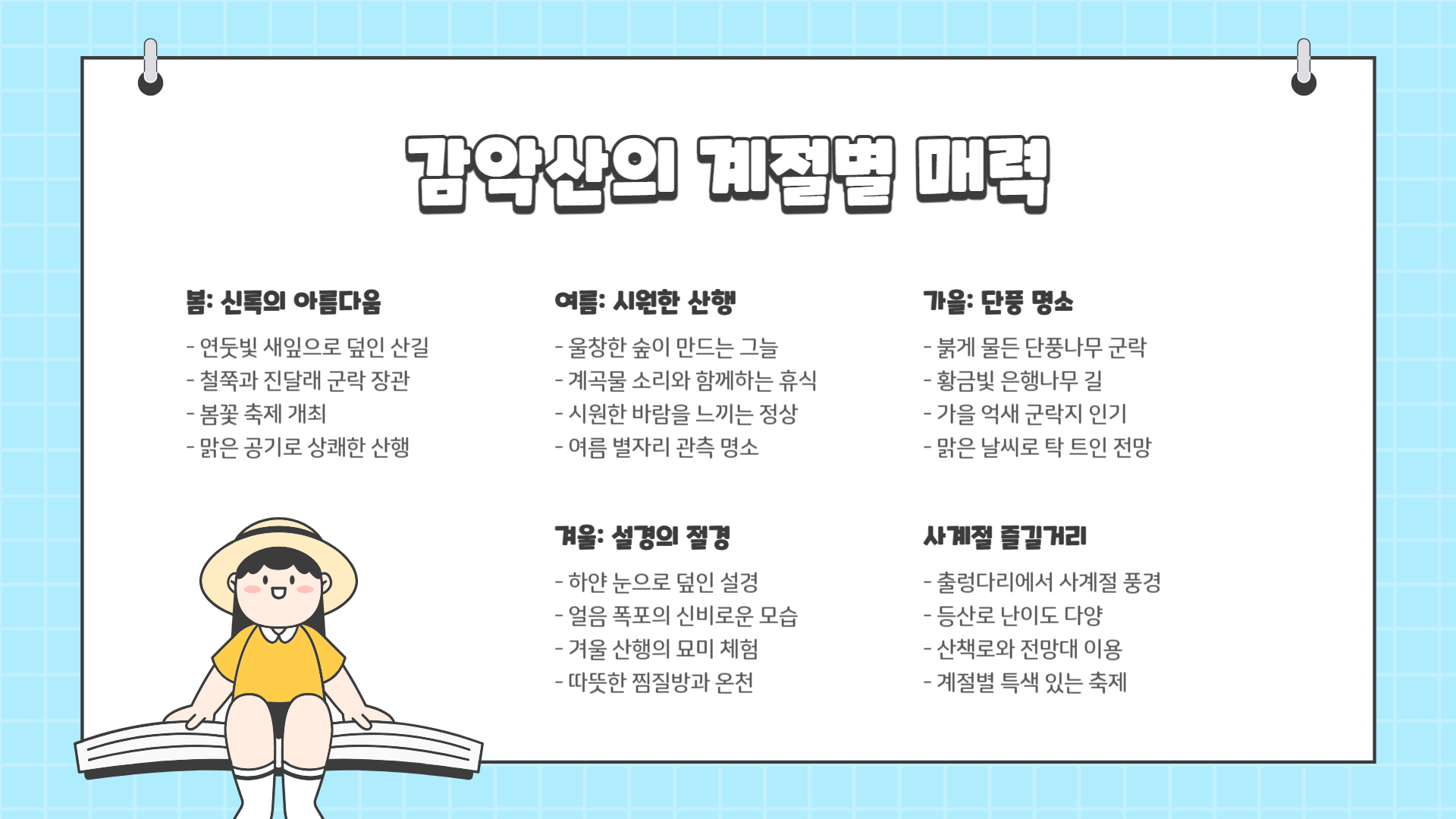 - 봄에는 튤립, 여름에는 연꽃, 가을에는 단풍, 겨울엔 설경