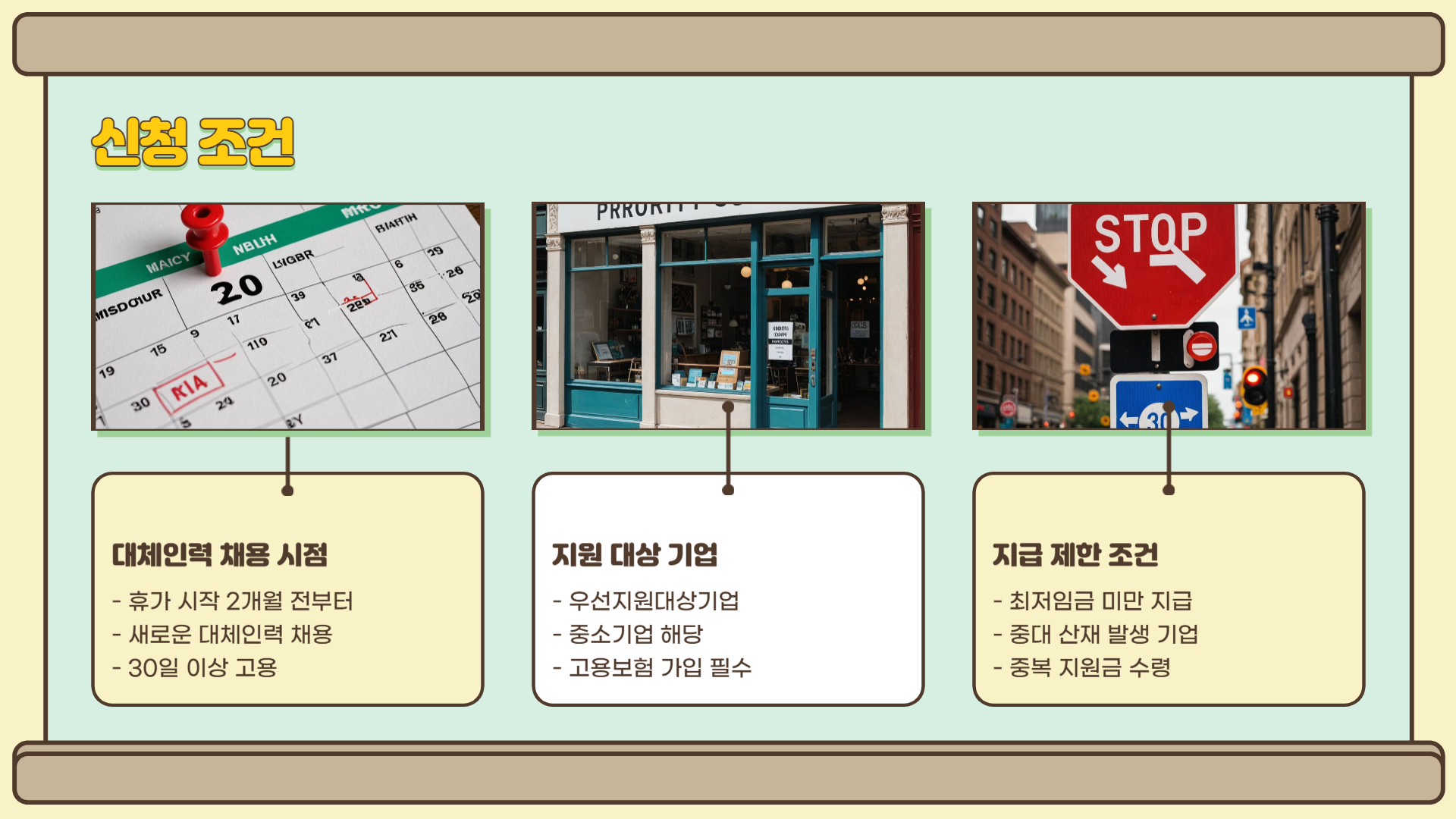 - 대체인력 고용 조건: 휴가 시작 전 2개월 이내에 신규 고용 + 30일 이상 계속 고용