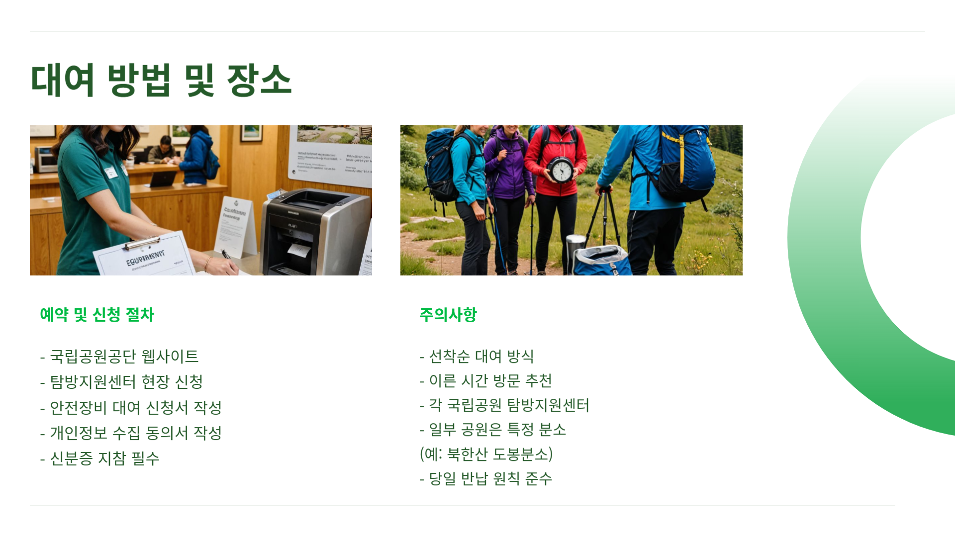 - 방문 전에는 꼭 국립공원공단 홈페이지에서 대여 가능 품목과 장소 확인하기.