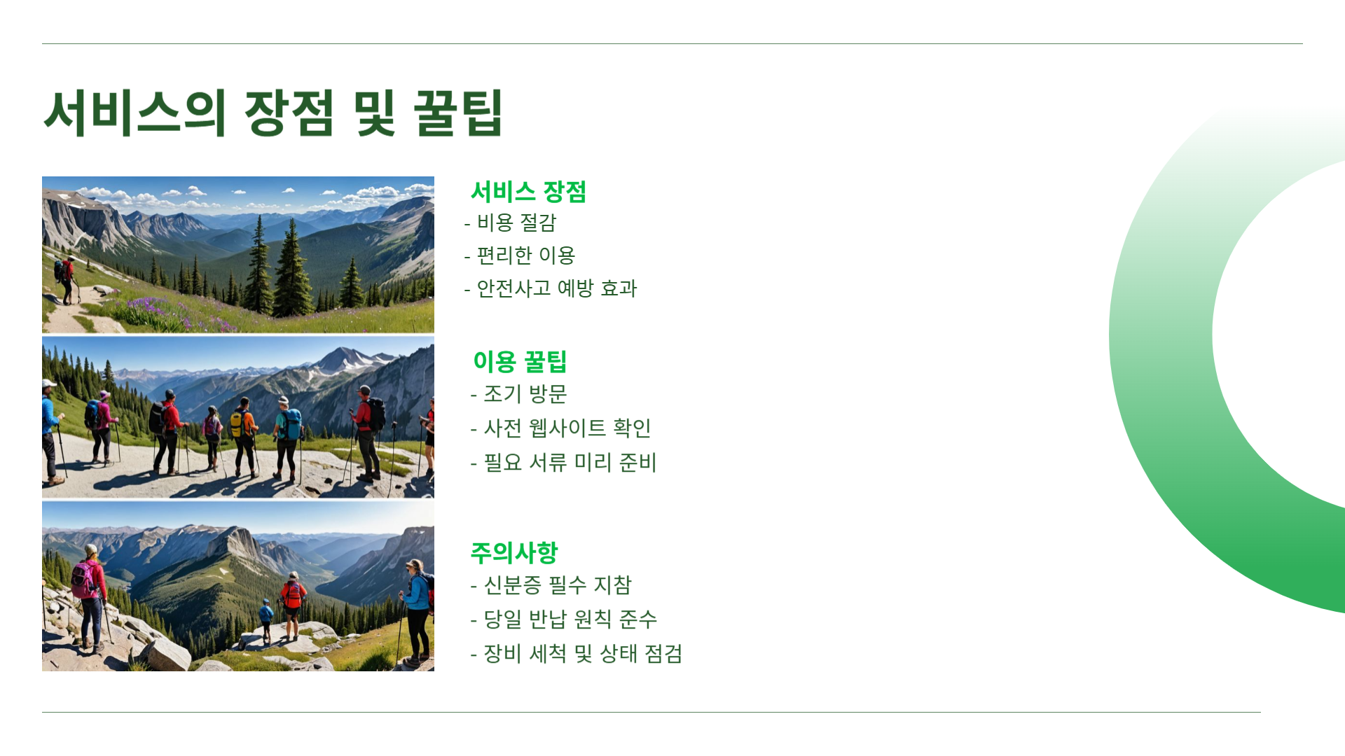 이 서비스를 이용하면 장비를 별도로 구입할 필요가 없어 비용 절감은 물론이고, 여행 가방이 가벼워져 이동이 훨씬 편리해집니다. 그리고 무엇보다, 등산 중 발생할 수 있는 안전사고를 예방하는 데 큰 도움이 돼요.