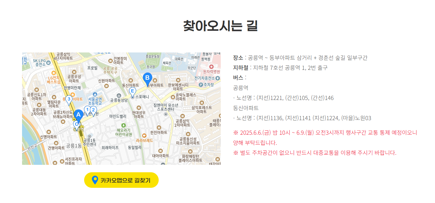 - 주차장: 공릉동 633-19 인근 공영주차장 (60분당 3,000원)
