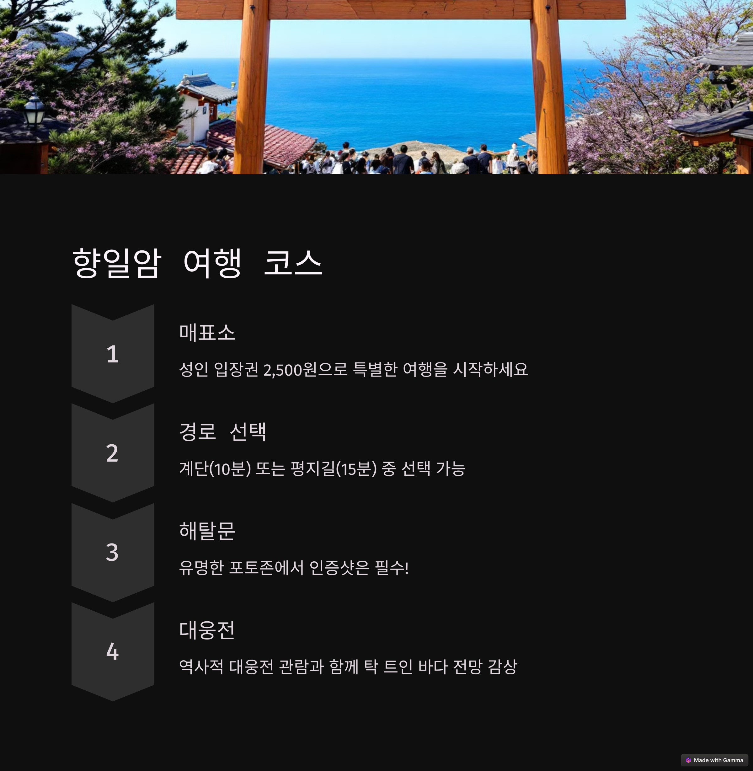 향일암을 방문할 때는 주요 코스를 미리 계획하는 것이 중요합니다. 매표소에서 입장권을 구매한 후 계단과 평지길 중 선택하여 이동할 수 있습니다. 계단길은 10분 정도 걸리며, 평지길은 15분 정도 소요됩니다. 중간에는 해탈문이라는 포토존이 있어 방문객들이 인증샷을 남기는 명소로 사랑받고 있습니다. 또한 대웅전 관람 후 바다 전망을 감상하며 향일암의 매력을 만끽할 수 있습니다.