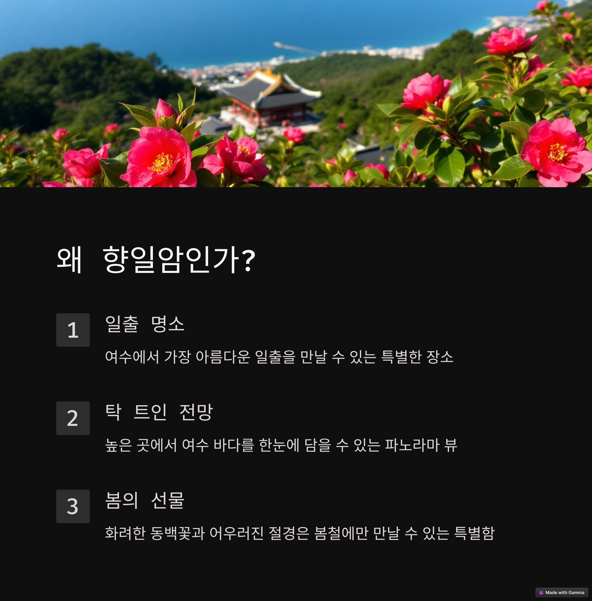 따뜻한 봄이 찾아오면서 여행을 계획하는 분들이 많아지고 있습니다. 그중에서도 여수 향일암은 2025년 봄철 최고의 여행지로 추천되고 있는데요. 여수 향일암은 전라남도 여수시 돌산읍에 위치한 아름다운 절로, 높은 곳에서 바라보는 탁 트인 바다 전망이 일품입니다. 향일암은 우리나라 4대 관음 기도 도량 중 하나로, 새해 일출 명소로도 유명한 곳입니다. 많은 방문객들이 힐링과 기도를 위한 여행으로 찾으며, 특히 봄철에는 동백꽃과 어우러진 절경을 감상할 수 있습니다.