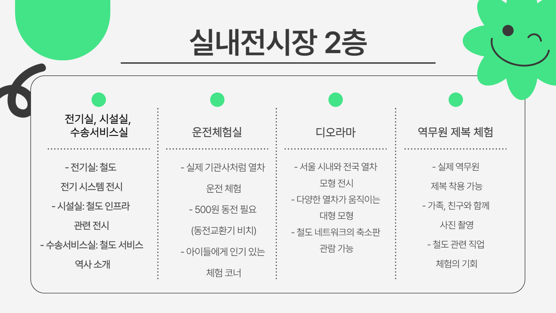 - 사진 포인트: 제복 체험, 디오라마, 실외 열차