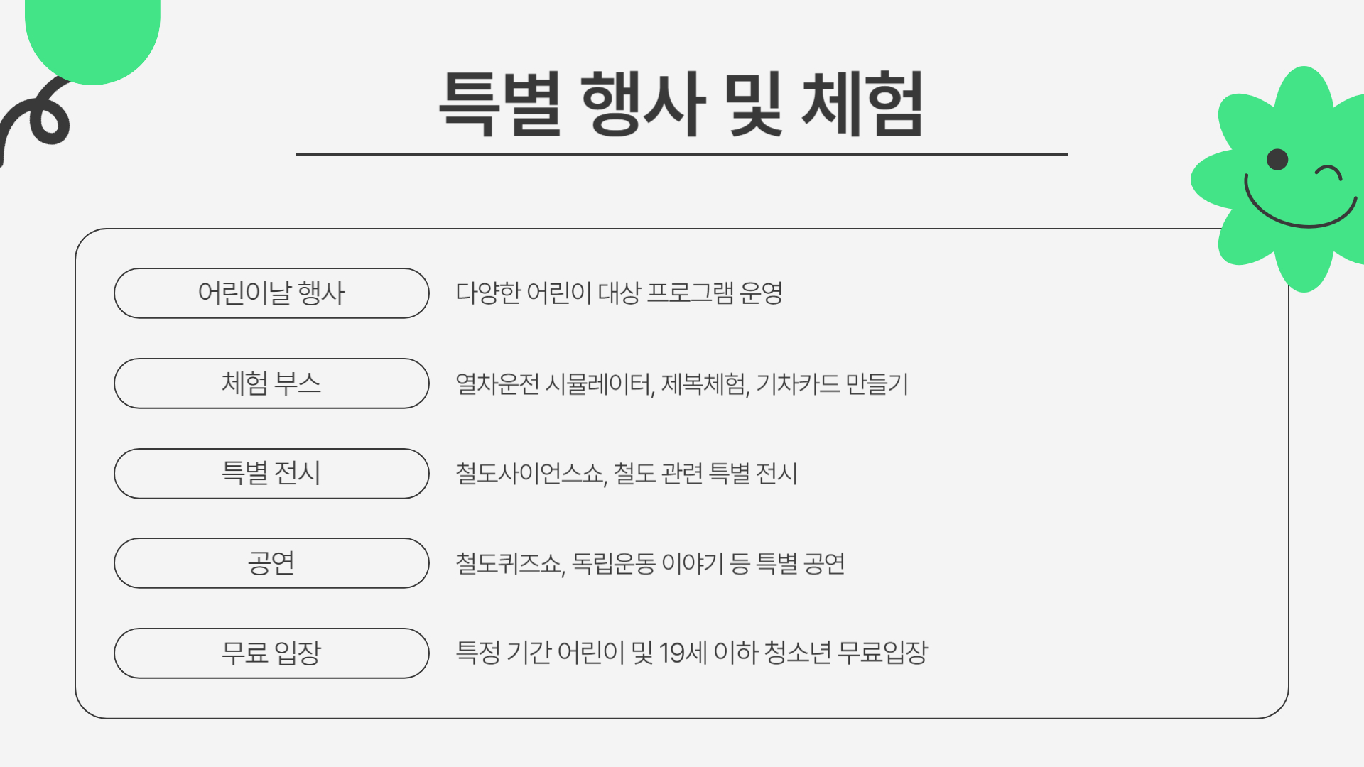 - 주차: 박물관 앞 무료 주차장 넉넉 (만차 시 코레일 인재개발원 주차장 이용 가능)