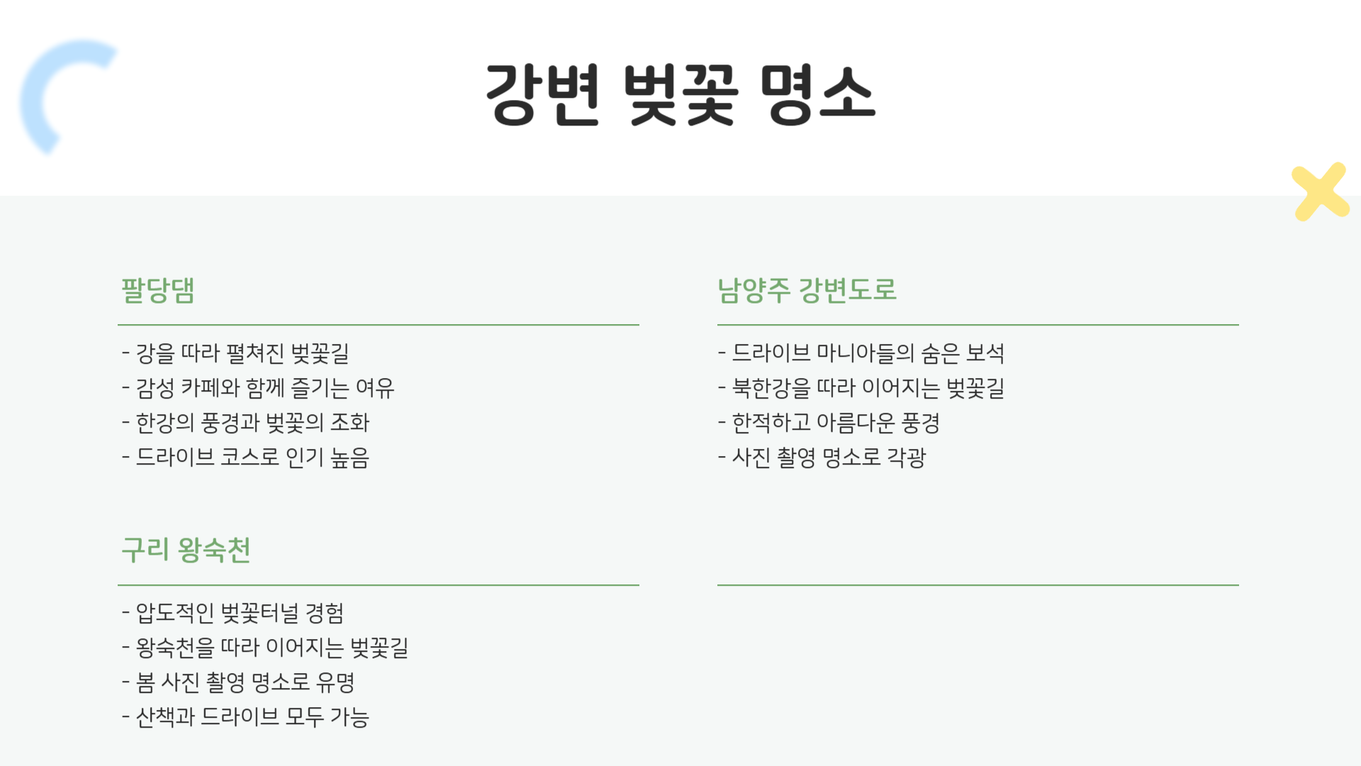| 팔당호 벚꽃길 | 물가 풍경 + 벚꽃 | 오전 10시~12시 |