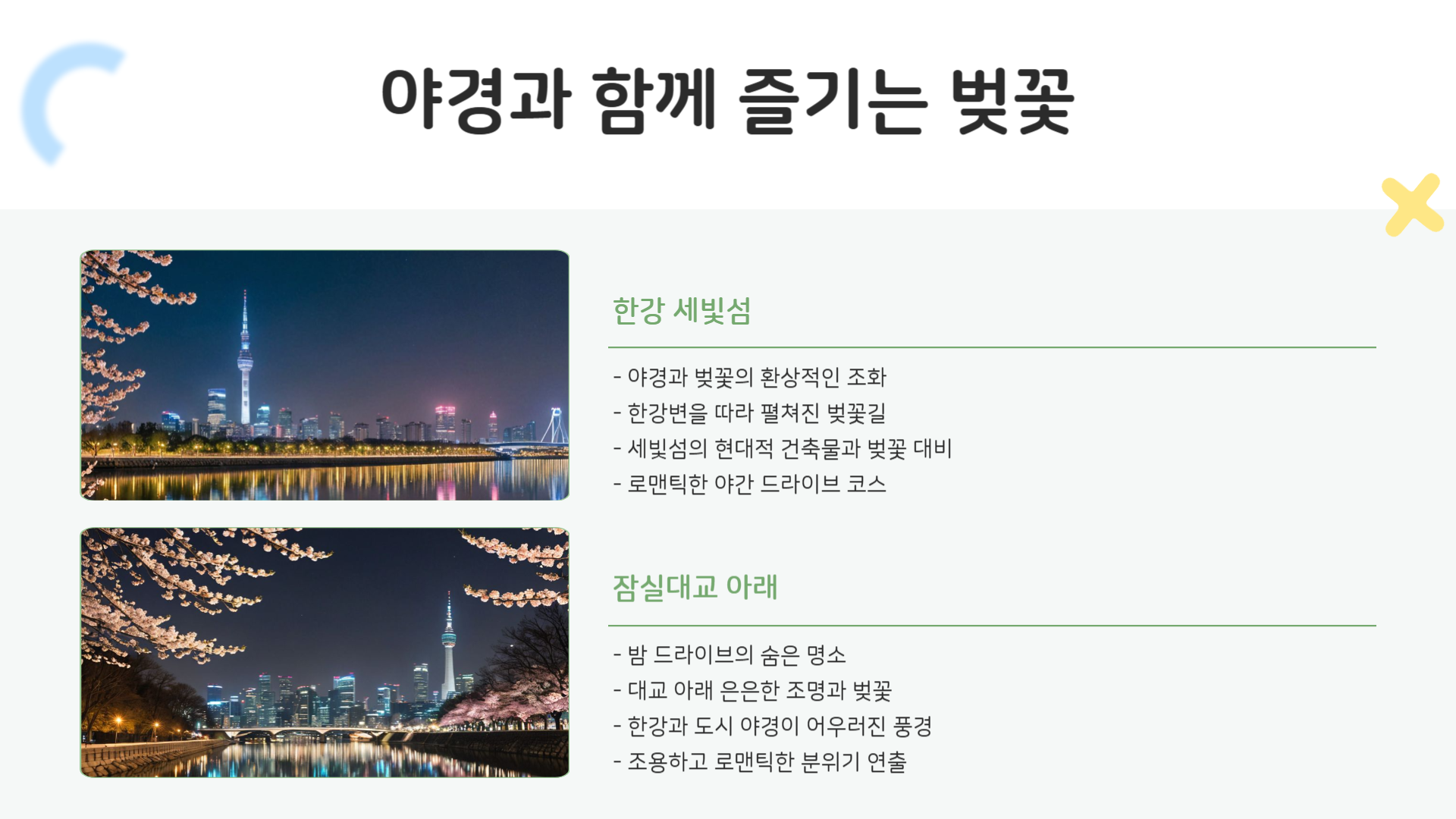 낮에도 예쁘지만 밤에는 또 다른 매력을 뽐내는 벚꽃길. 특히 조명이 은은하게 비치는 강변이나 도심 공원 주변은 로맨틱한 분위기 가득이에요. 친구랑, 연인이랑, 아니면 혼자서라도 충분히 힐링할 수 있는 시간. 특히 추천하고 싶은 코스는 반포대교~한강 세빛섬 구간과 잠실대교 아래쪽 벚꽃 산책길입니다.