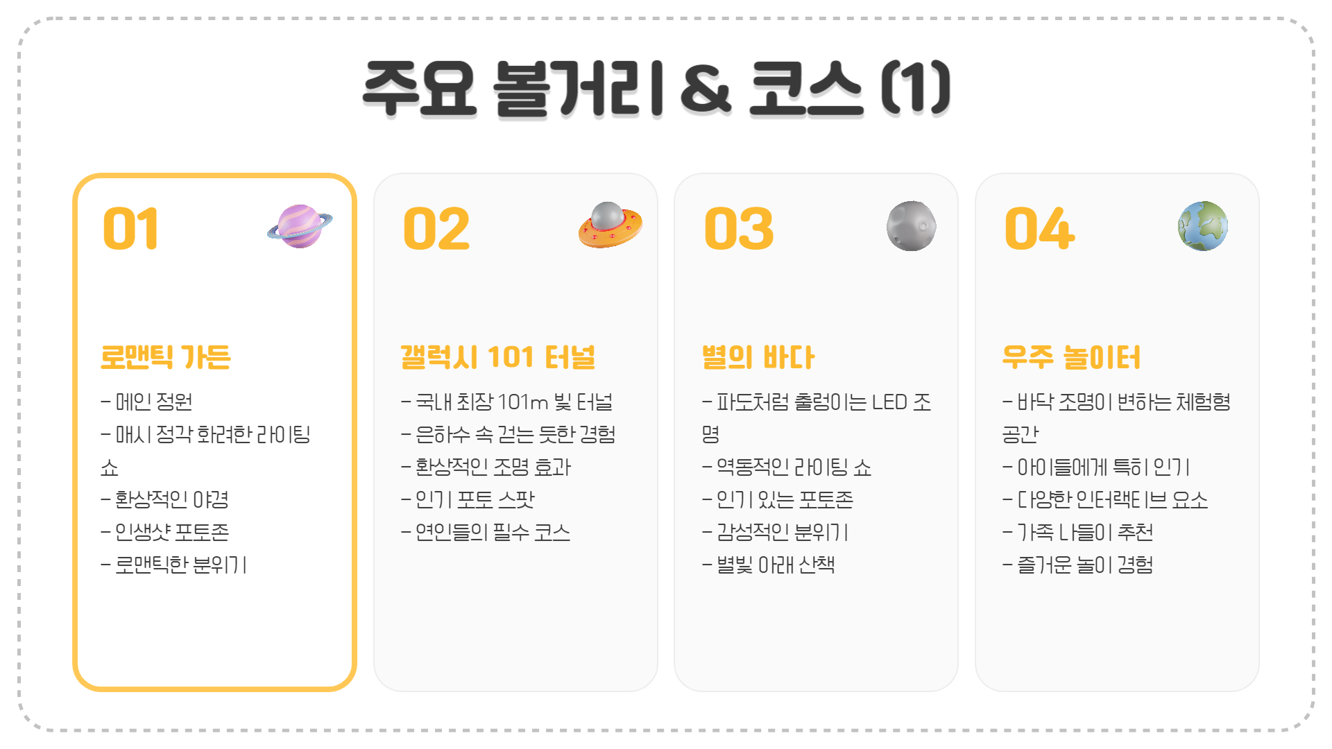 별빛정원우주의 주요 볼거리는 조명 쇼부터 체험 공간까지 다양하게 구성되어 있어, 방문객 모두가 만족할 수 있는 코스를 제공합니다.