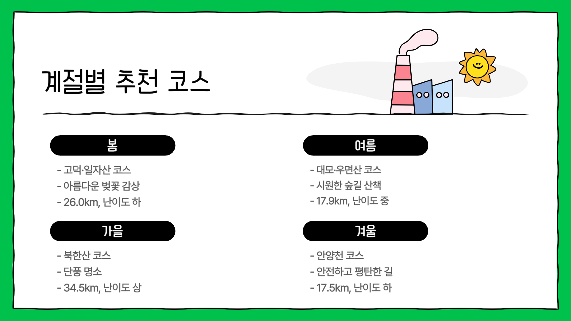 - 코스 난이도를 고려하여 체력에 맞게 선택