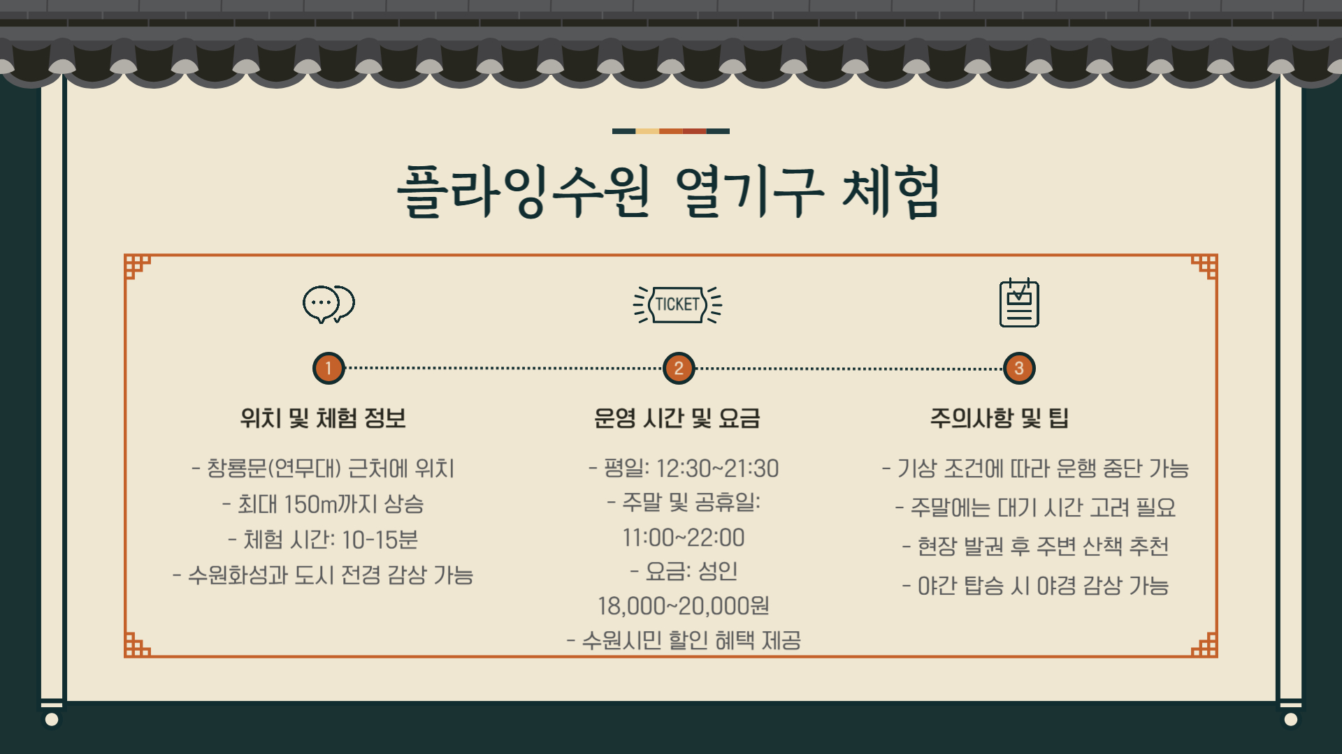 창룡문 근처 연무대에서 탑승하며, 헬륨 기구를 타고 최대 150m 상공까지 올라 수원을 내려다보는 특별한 체험이 가능합니다.