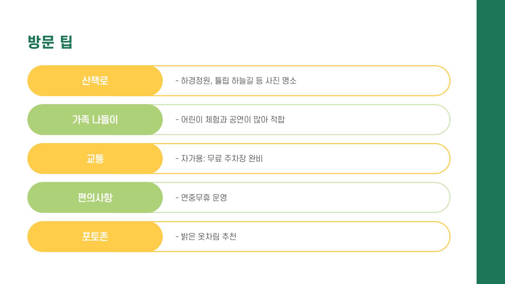 특히 올해는 ‘튤립 하늘길’이라는 이름의 새로운 포토 명소가 생겨서, 사진 찍기 좋아하는 분들에겐 천국 같은 공간일 거예요. 친구, 연인, 가족 누구와 함께 와도 만족스러운 하루가 될 테니 일정 조정해서 꼭 들러보시길 강추해요!