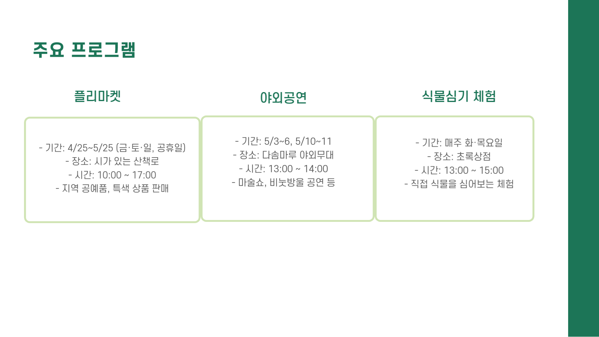 | 야외공연 | 5.3~6 & 5.10~11, 13:00~14:00 | 다솜마루 야외무대 |