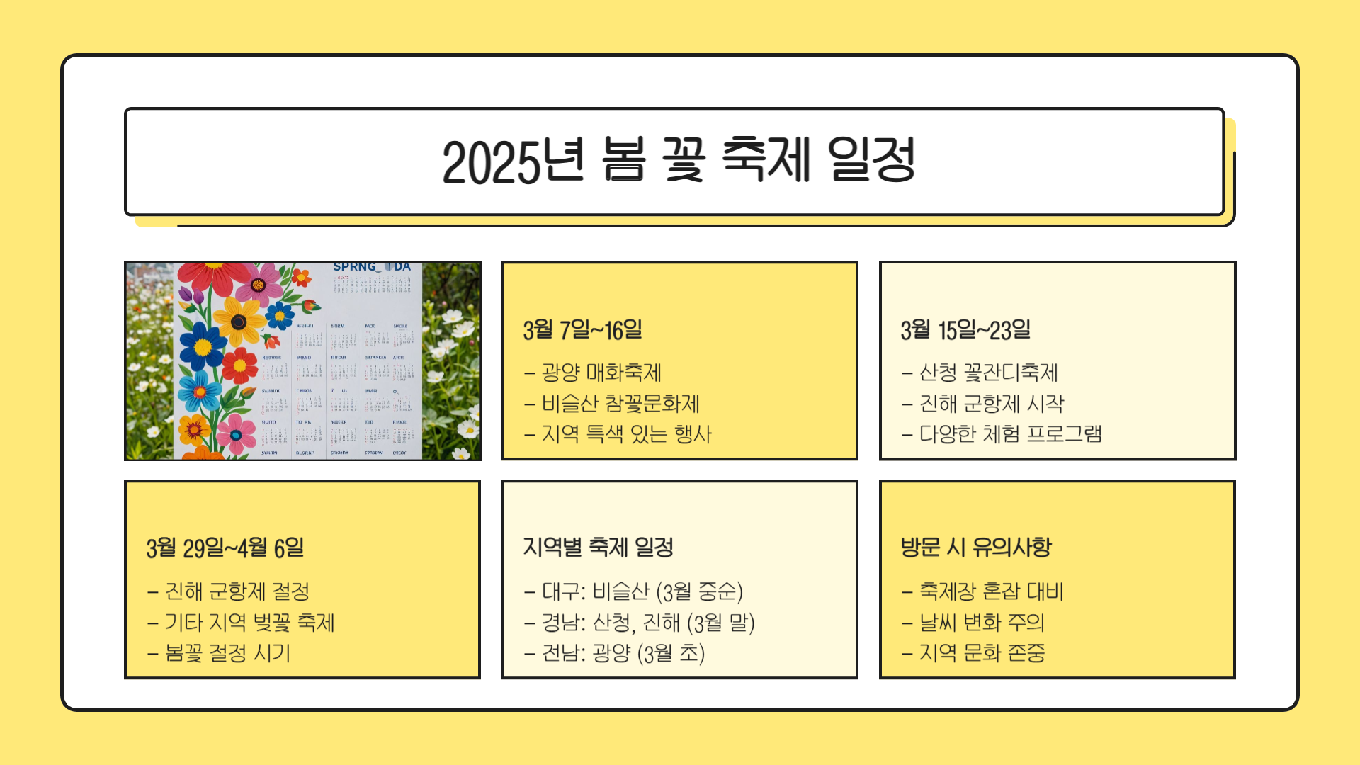 봄바람이 살랑살랑 불어오면 자연스럽게 꽃구경을 떠올리게 됩니다. 특히 2025년은 전국 각지에서 화려한 봄꽃 축제가 펼쳐질 예정이라 여행을 계획하는 분들에게는 더없이 좋은 기회가 될 텐데요. 대구의 비슬산 참꽃문화제부터 진해의 군항제, 산청에서 열리는 꽃잔디축제, 그리고 광양의 매화마을까지 각 지역마다 다양한 매력적인 풍경이 여러분을 기다리고 있습니다. 이번 포스팅에서는 2025년 봄을 더욱 특별하게 만들어 줄 전국 봄꽃 명소와 축제 일정을 정리해드릴게요. 벚꽃, 참꽃, 매화 등 눈부시게 아름다운 꽃들을 직접 만나볼 수 있는 시간! 지금부터 설렘 가득한 꽃 여행 가이드를 시작해볼까요?