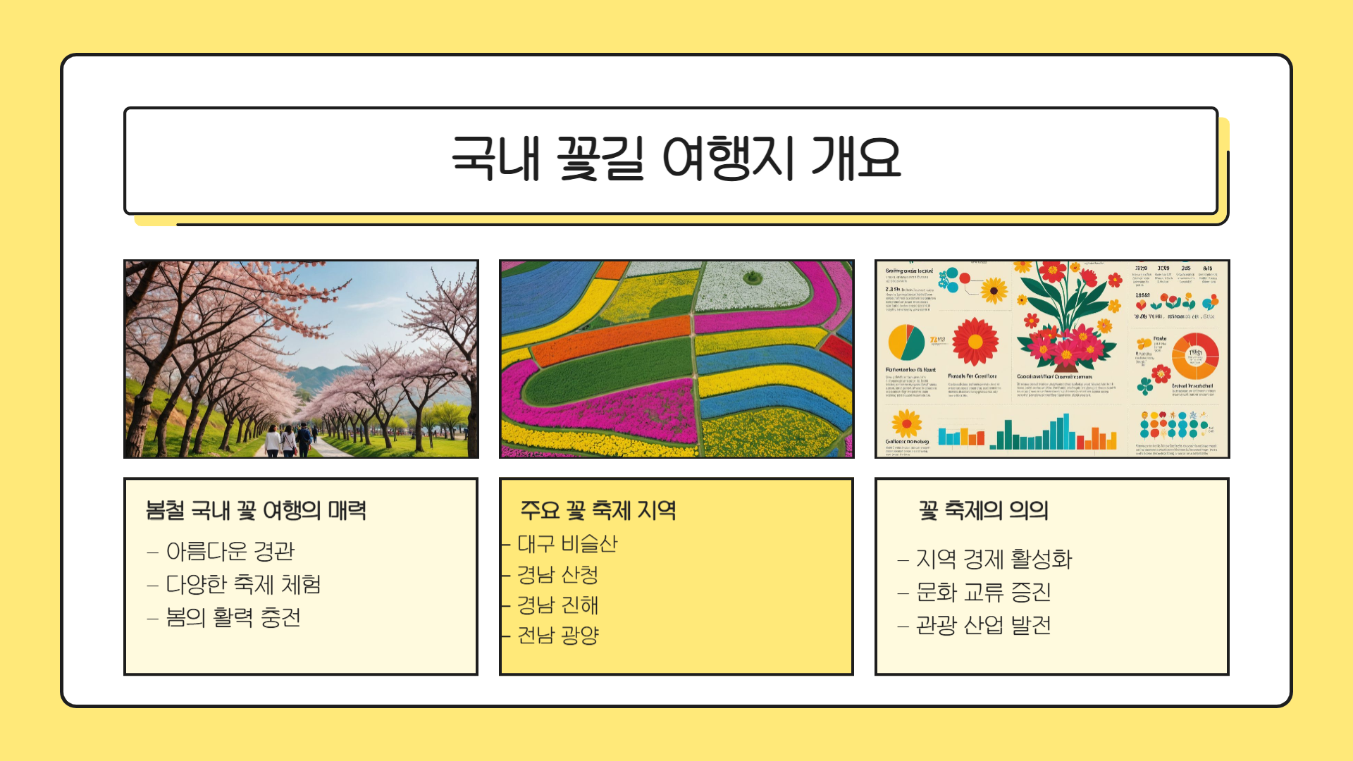 봄의 설렘을 가득 안고 떠나는 봄꽃 여행. 자연의 아름다움과 함께 기분 좋은 힐링을 선물해주는 전국의 봄꽃 명소는 단순한 여행지를 넘어 소중한 추억을 쌓을 수 있는 특별한 장소입니다. 진해, 대구, 산청, 광양 등 각 지역의 축제를 통해 봄의 정취를 온몸으로 느껴보세요. 가족과 연인, 친구와 함께하는 봄꽃 여행은 평생 기억에 남을 행복한 시간이 될 것입니다. 2025년 봄, 여러분도 사랑하는 사람들과 꽃길만 걸으시길 바랍니다