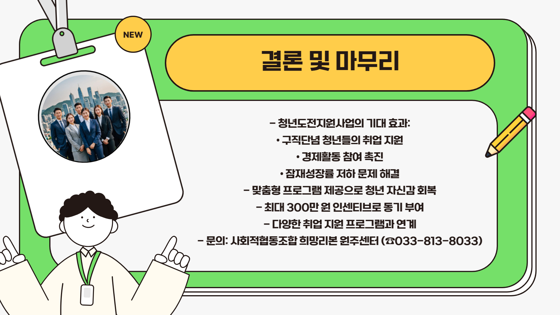 원주시의 청년도전지원사업은 단순한 고용정책을 넘어서, 삶의 전반을 변화시키는 사회적 시스템으로 자리매김할 가능성이 큽니다. 현재 많은 청년들이 막막한 현실 속에서 방향을 잃고 있으며, 이들이 다시 일어설 수 있도록 돕는 것이 우리 사회의 책임입니다. 프로그램을 통해 청년들은 심리적 안정과 더불어 실제적인 취업 역량을 기를 수 있으며, 이는 장기적으로 지역 경제와 사회 발전에 긍정적인 파급 효과를 가져올 것입니다. 다양한 배경을 가진 청년들이 함께 성장하고 연대할 수 있도록, 보다 많은 시민들이 이 사업에 관심을 가지고 응원해 주셨으면 합니다.