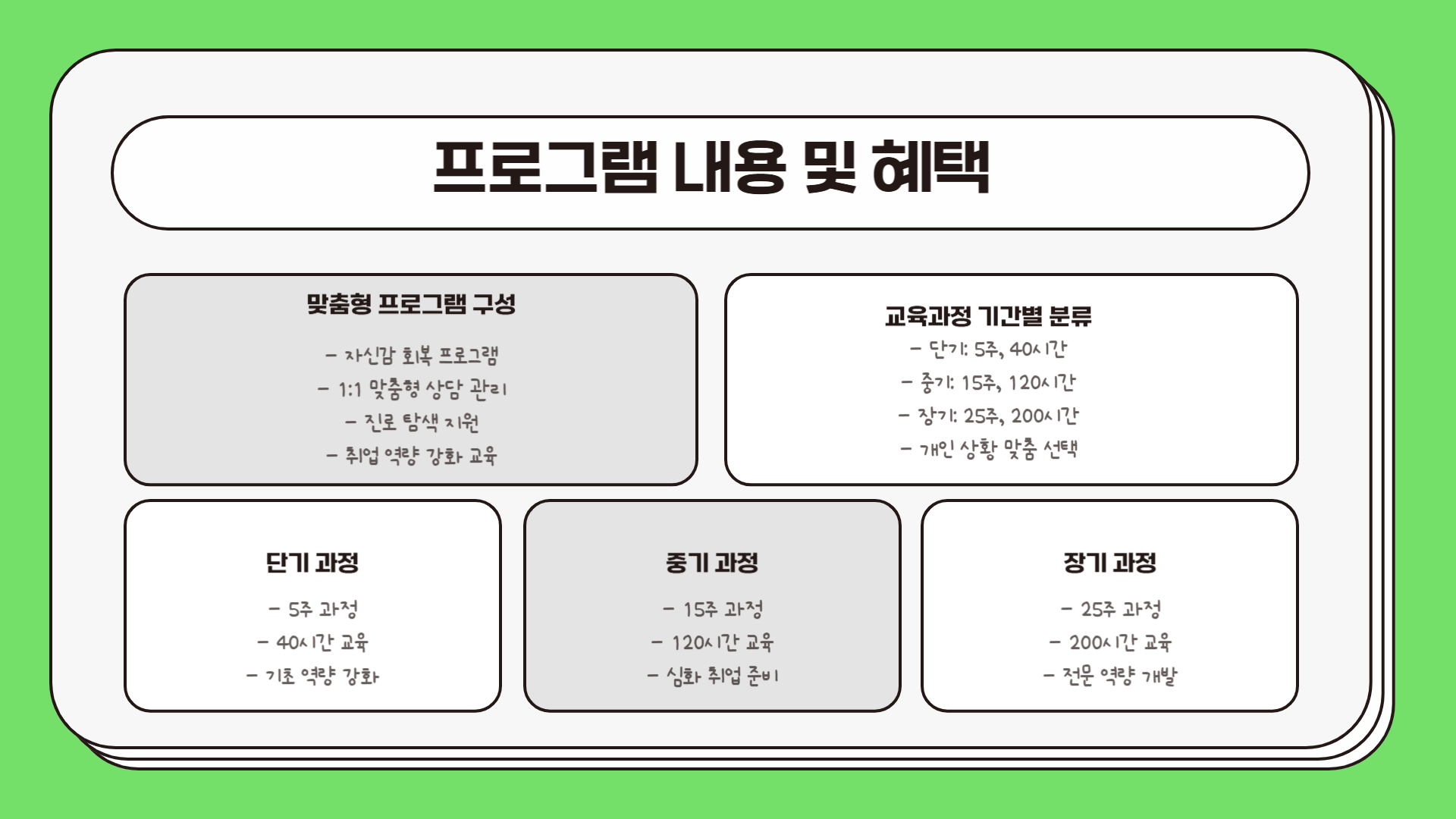| 프로그램 구성 | 맞춤형 상담, 진로탐색, 취업역량 강화 등 포함 |