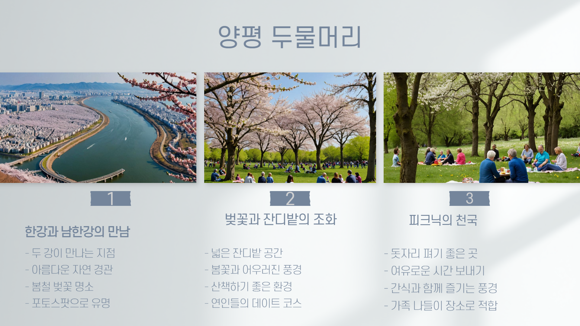 먼저 소개할 곳은 양평의 두물머리입니다. 이곳은 한강과 북한강이 만나는 지점으로 탁 트인 잔디밭과 함께 벚꽃이 절정에 달한 아름다운 장소입니다. 사진 찍기 좋은 명소로도 유명하며, 아침 일찍 도착하면 붐비지 않아 피크닉을 즐기기에도 안성맞춤이에요. 다음은 춘천 근교의 남이섬. 자전거를 대여해 섬을 한 바퀴 도는 코스는 연인, 친구와 함께하기에 최고의 힐링 루트랍니다. 다양한 봄꽃이 만개하여 걷기만 해도 기분이 좋아지는 코스입니다.