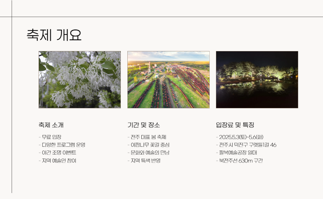 매년 5월 초가 되면 전라북도 전주시 팔복동 철길에는 하얀 이팝나무꽃이 만개합니다. 이 아름다운 자연을 배경으로 열리는 전주 이팝나무 기찻길 축제는 가족, 연인, 친구 누구와 함께해도 좋은 봄맞이 여행지로 손꼽힙니다. 2025년에도 어김없이 돌아온 이 축제는 무료 입장이 가능하며, 낮에는 꽃길 산책, 밤에는 화려한 경관 조명과 EDM 파티까지 이어져 전주의 봄을 더욱 특별하게 만들어줍니다.