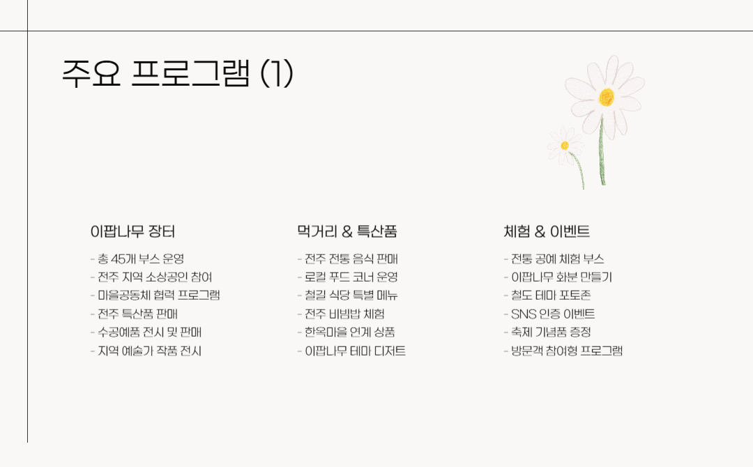 전주 지역 소상공인과 마을 공동체가 참여하는 이팝나무 장터에서는 다양한 로컬 제품과 먹거리를 즐길 수 있습니다. 전주 굿즈, 핸드메이드 수공예품, 디저트, 철길 감성 음식 등 45개 부스가 운영되어 보는 재미, 먹는 즐거움을 더해줍니다.