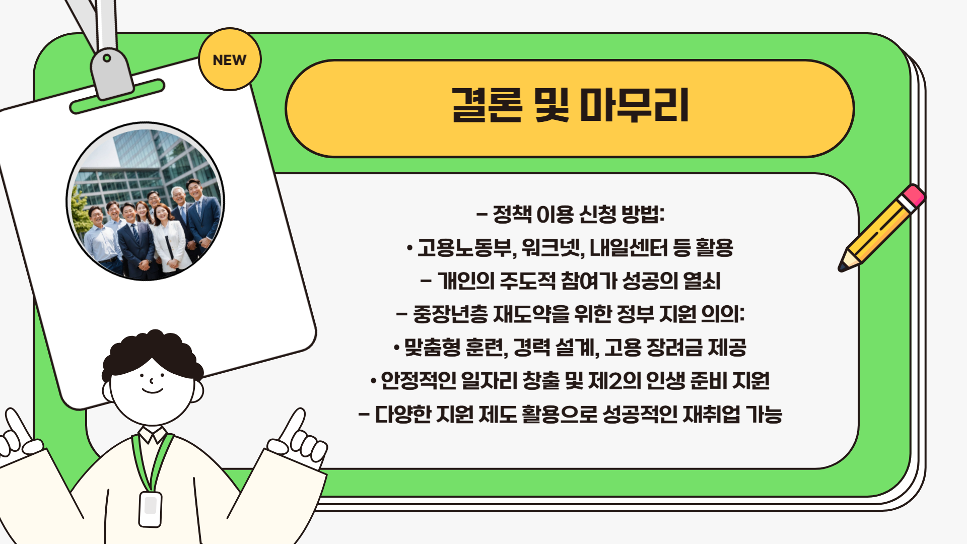 중장년층의 재취업은 단순한 일자리 문제를 넘어서 삶의 질과 사회적 연결성 회복에 중요한 역할을 합니다. 정부는 이를 인식하고 적극적인 제도 마련에 나서고 있으며, 실제로 많은 분들이 이러한 정책을 통해 새로운 인생의 기회를 얻고 있습니다. 중요한 것은 정보를 제대로 알고, 나에게 맞는 제도를 빠르게 신청하고 활용하는 것입니다. 앞으로도 이러한 정책들이 보다 체계적으로 운영되고, 실질적인 변화로 이어지기를 기대해 봅니다.