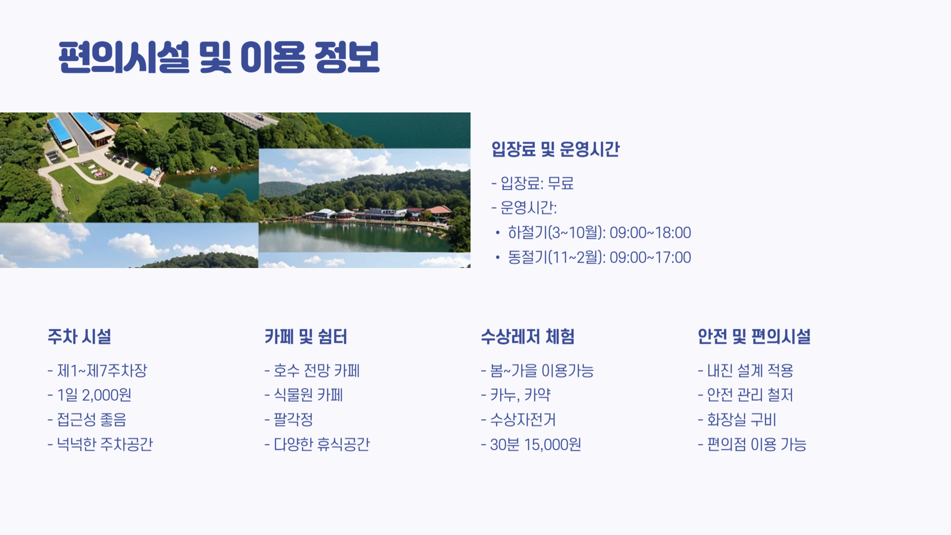 | 부대시설 | 카페, 팔각정, 수상레저 등 |