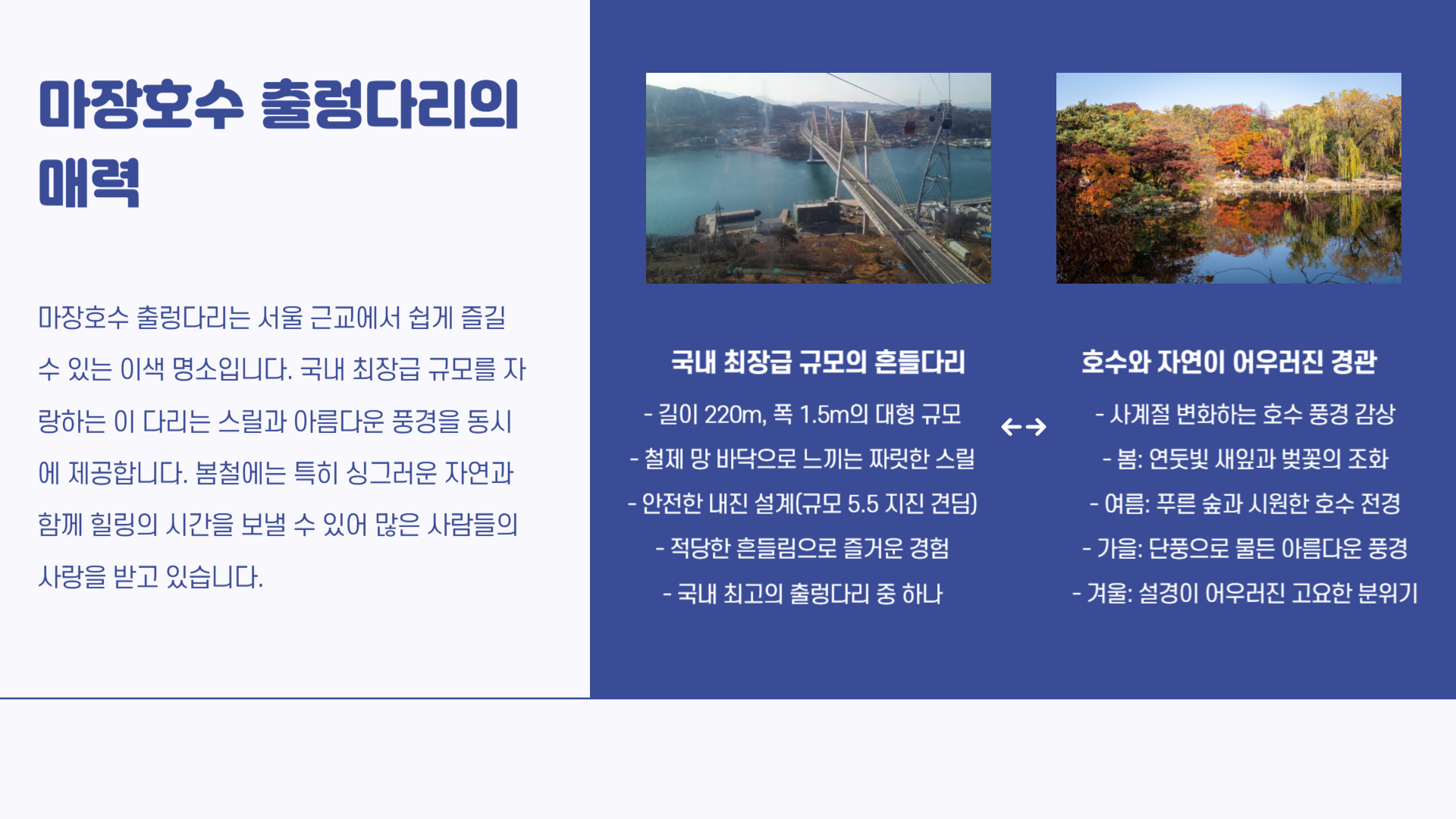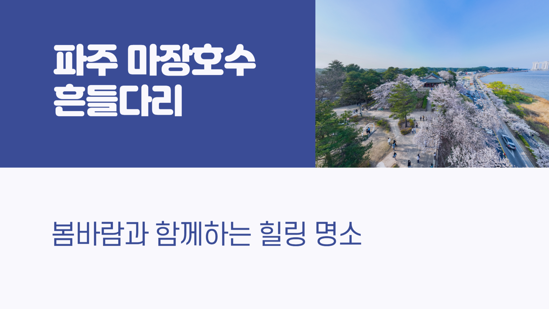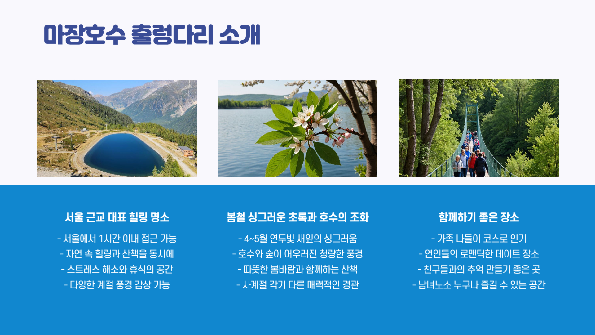 따뜻한 봄바람이 불어오는 요즘, 서울 근교에서 자연을 만끽하며 걷기 좋은 나들이 장소를 찾고 계신가요? 오늘 소개할 곳은 경기도 파주에 위치한 ‘마장호수 흔들다리’입니다. 넓은 호수와 숲길, 출렁이는 다리가 어우러진 이곳은 자연 속 힐링은 물론 스릴까지 경험할 수 있어 남녀노소 모두에게 인기 있는 명소예요. 서울에서 1시간 이내 거리로, 부담 없이 당일치기 여행으로도 안성맞춤입니다. 지금부터 마장호수 흔들다리의 매력과 방문 정보를 자세히 소개해드릴게요.