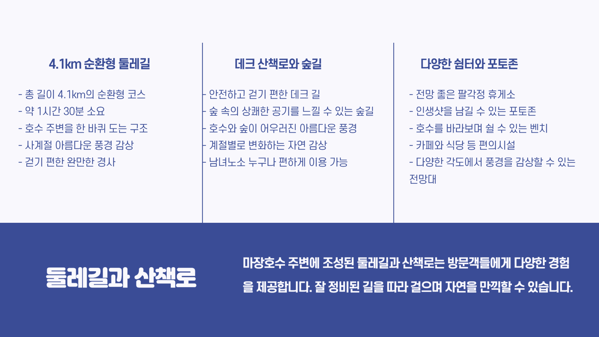 출렁다리를 건넌 뒤에는 약 4.1km의 둘레길이 기다리고 있어요. 잘 정돈된 데크와 숲길 덕분에 남녀노소 누구나 부담 없이 즐길 수 있죠. 다양한 쉼터와 전망대가 곳곳에 마련되어 있어, 잠시 쉬어가며 자연을 음미하기 딱 좋아요.