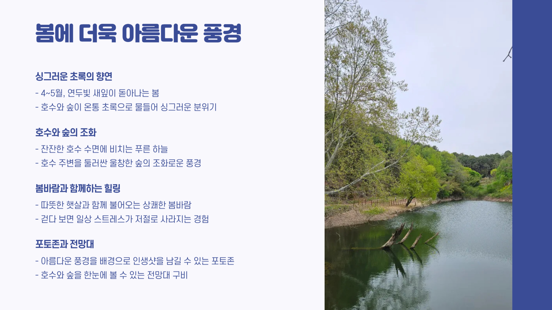 특히 4~5월 봄철에는 연두빛 새잎이 호수를 둘러싸며 싱그러움이 절정에 달해요. 봄바람을 맞으며 걷는 이 둘레길은 단순한 산책을 넘어선 치유의 시간이 되죠.