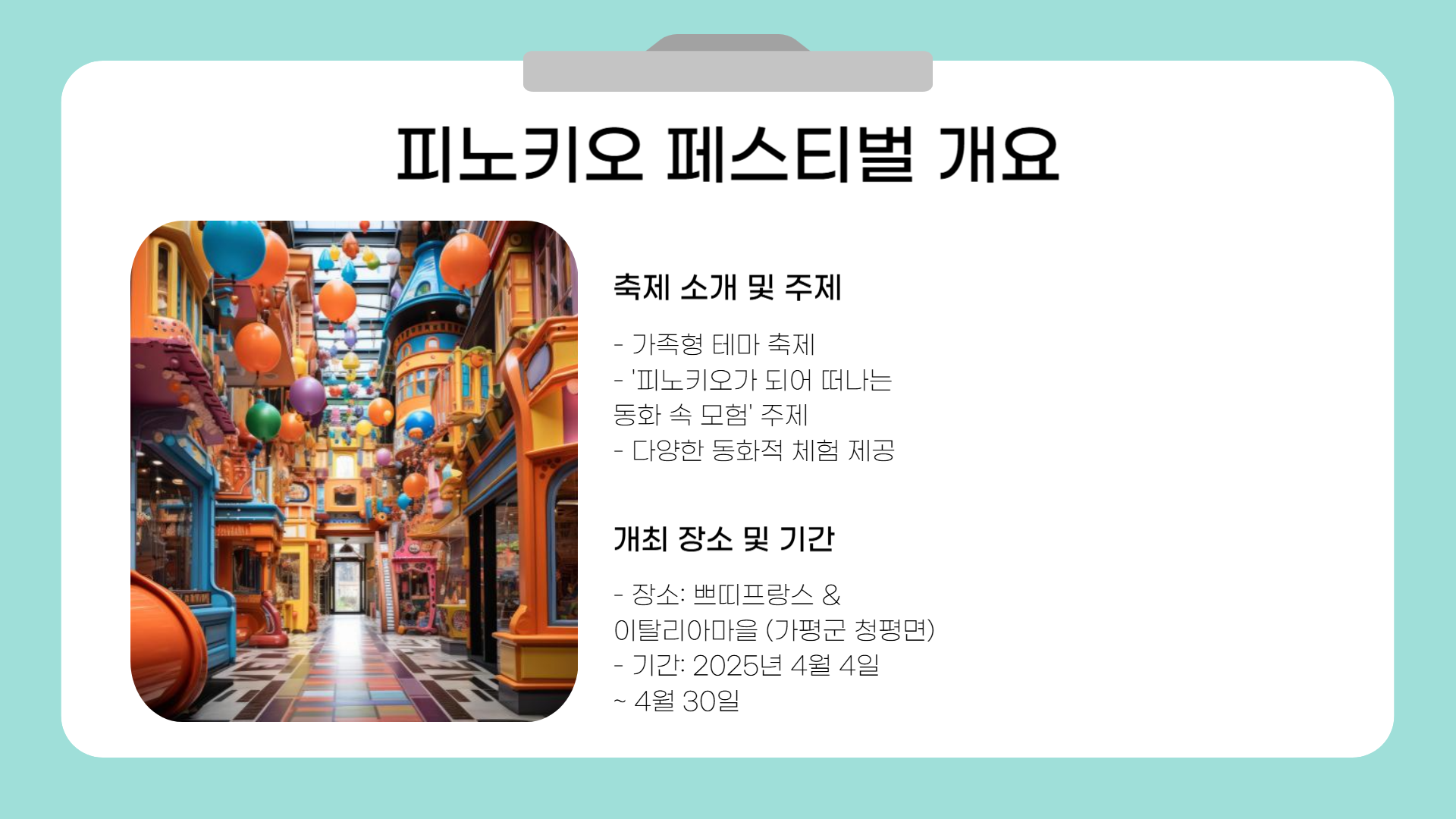 경험이 될 것입니다. 가평 쁘띠프랑스와 이탈리아마을 특유의 이국적 분위기 속에서 동화 속 주인공이 되어보는 하루는 남녀노소 누구에게나 잊지 못할 추억이 됩니다. 봄나들이와 여행지로 고민 중이라면, 피노키오 페스티벌 2025를 적극 추천드립니다. 지금 바로 일정 확인하시고 사랑하는 사람과 함께 가평으로 떠나보세요!