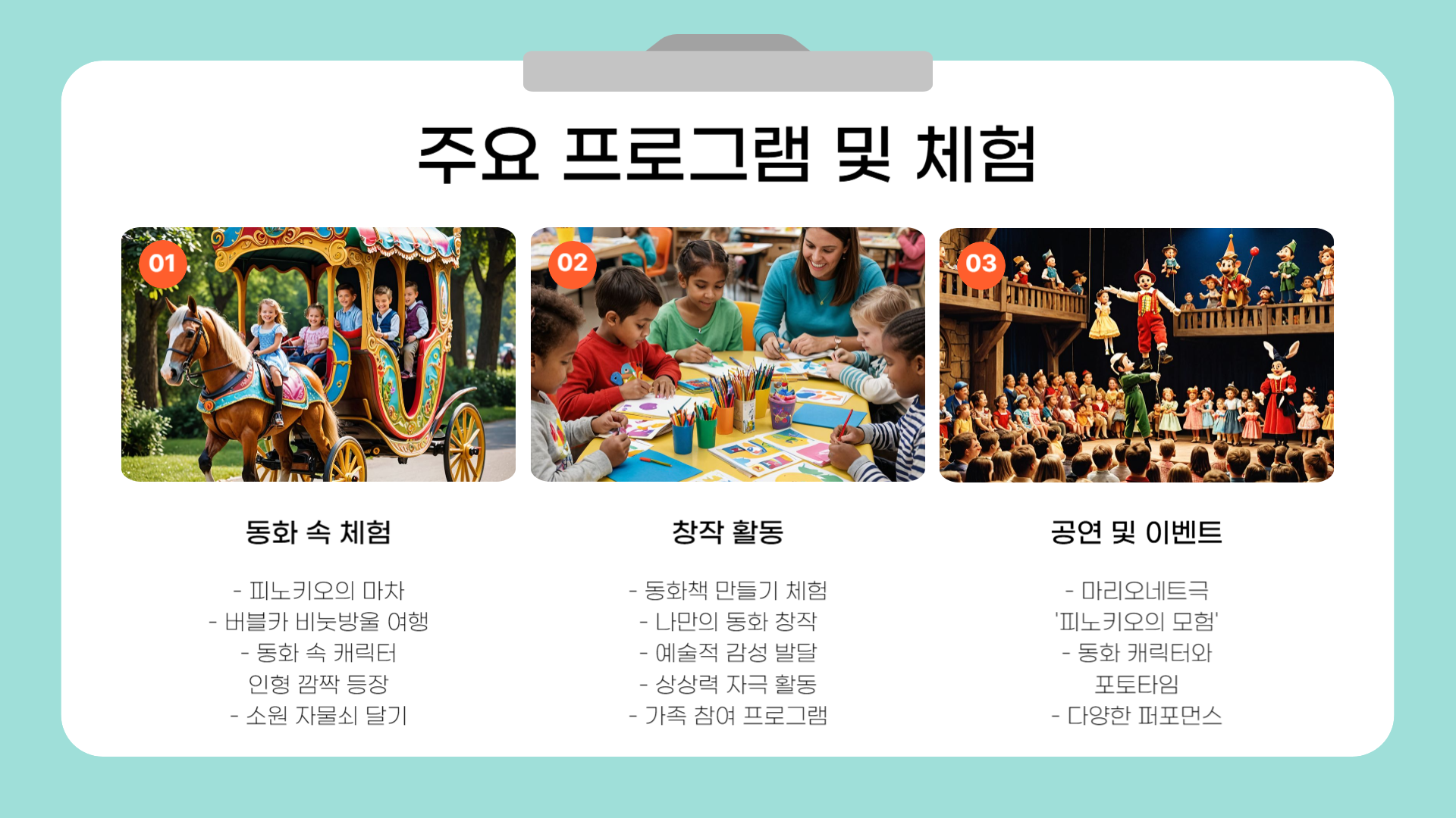| 어린 자녀를 둔 가족 | 동화 속 캐릭터 체험과 인형극 등 어린이 맞춤형 콘텐츠 |
