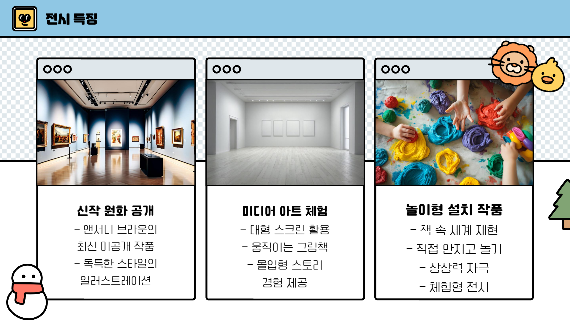 이번 2025 앤서니 브라운 전시회는 단순한 회화 감상이 아닌 새로운 형태의 몰입형 체험으로 구성되어 있습니다. 예술의전당 한가람미술관에서 열리는 본 전시는 기존 그림책 속 캐릭터를 현대적인 시선으로 재해석한 작품들을 포함하여 미디어 아트, 영상 콘텐츠, 설치 예술까지 더해진 다채로운 콘텐츠로 구성되어 있습니다. 특히, 이번에는 앤서니 브라운의 미공개 최신 원화가 최초로 공개될 예정이어서 팬들의 기대를 한껏 높이고 있습니다.