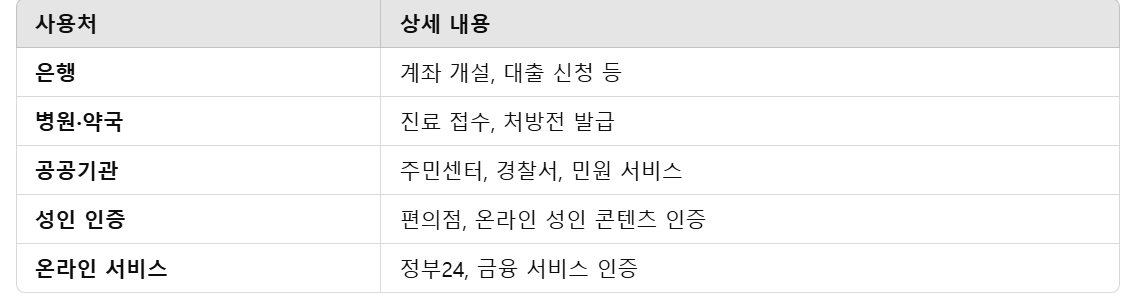 ✔ 실물 신분증과 동일한 효력을 가지며, 다음과 같은 곳에서 사용할 수 있습니다.