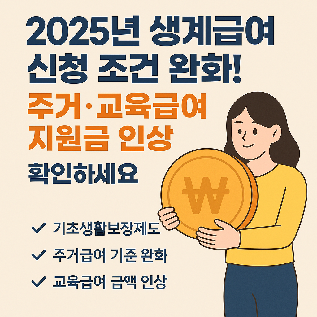 생계급여는 기초생활보장제도의 핵심이며, 매달 현금으로 지급되는 지원입니다. 2025년부터는 지급 금액이 인상되고, 자동차 소유 기준과 부양의무자 조건도 완화되어 더 많은 국민이 생계급여를 신청할 수 있게 되었습니다.