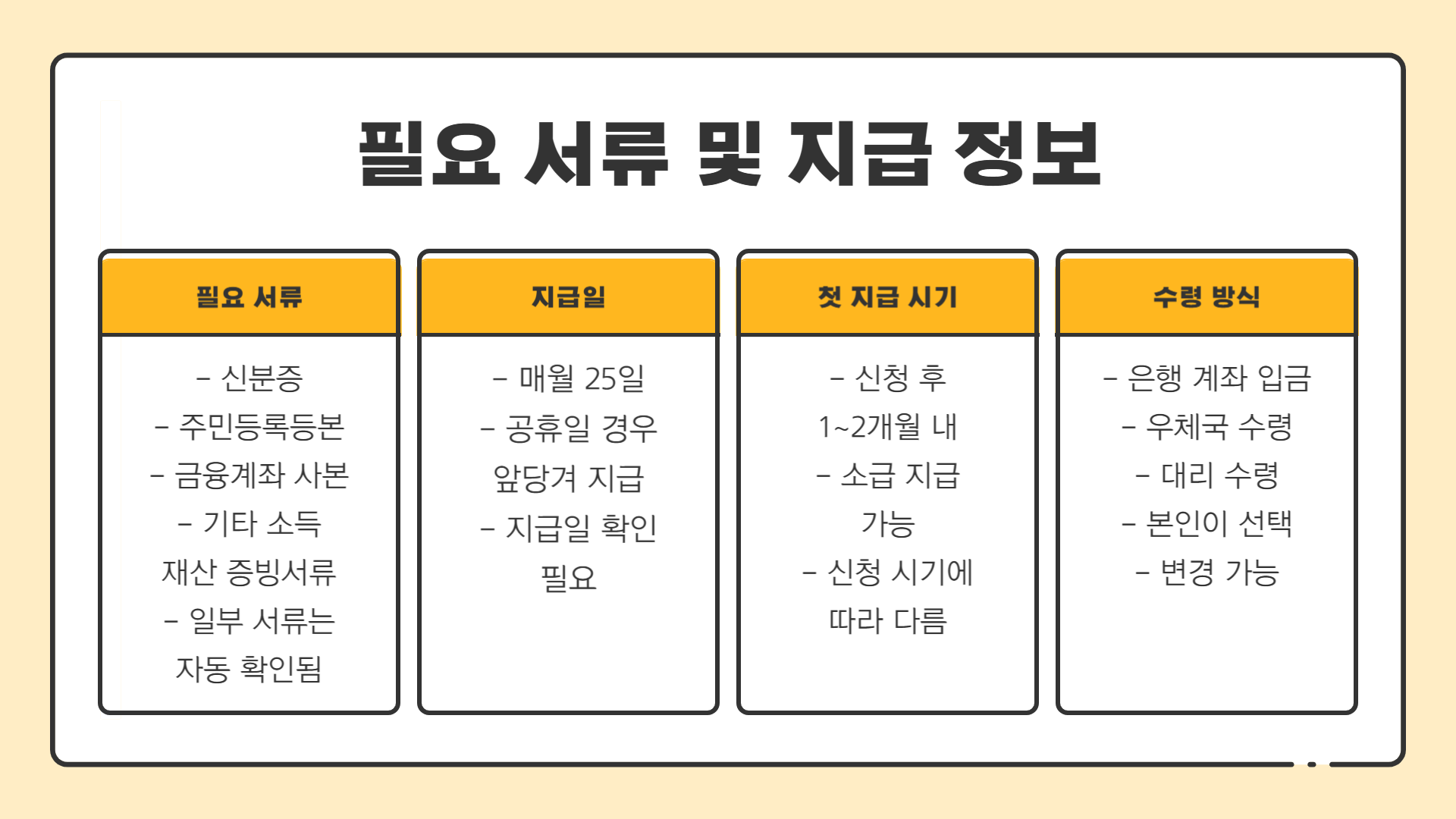 지급 일정은 매월 25일이며, 공휴일일 경우 앞당겨 지급됩니다. 신청 후 지급이 원활하게 이루어질 수 있도록 미리 필요한 서류를 준비하는 것이 중요합니다.