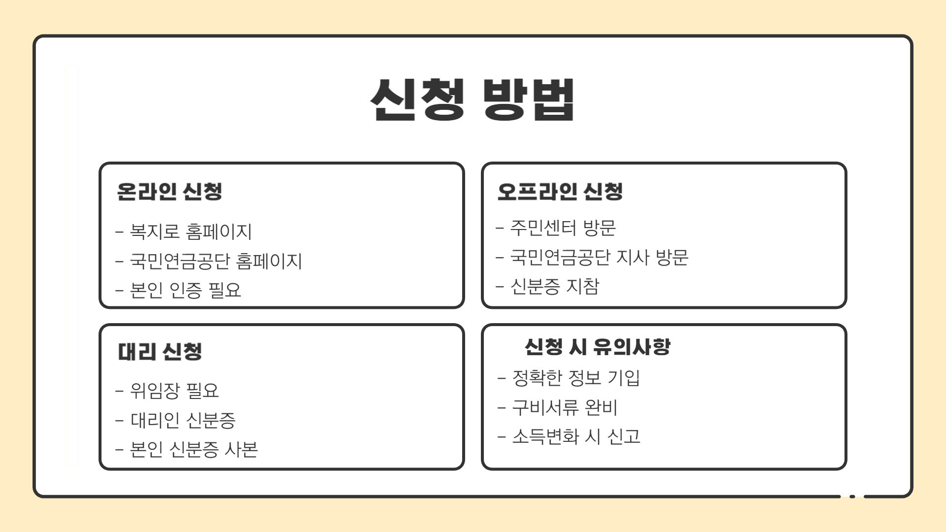 | 신청 가능 장소 | 주민센터, 국민연금공단 지사 또는 온라인 |