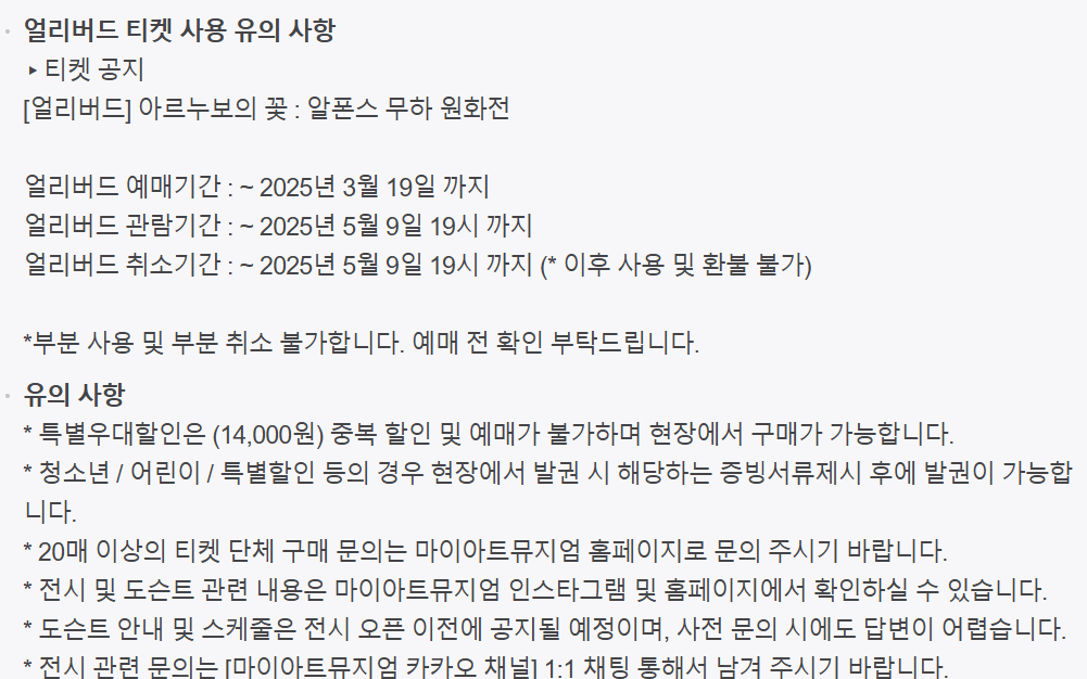 따스한 봄의 시작을 알리는 눈 호강 전시!! [관람정보] 아르누보의 꽃 : 알폰스 무하 원화전 - 전시 일정 : 2025년 3월 20일 ~ 2025년 7월 13일 - 관람 시간 : 월-일 10:00 - 19:40 (입장마감 19:00) - 전시 장소: