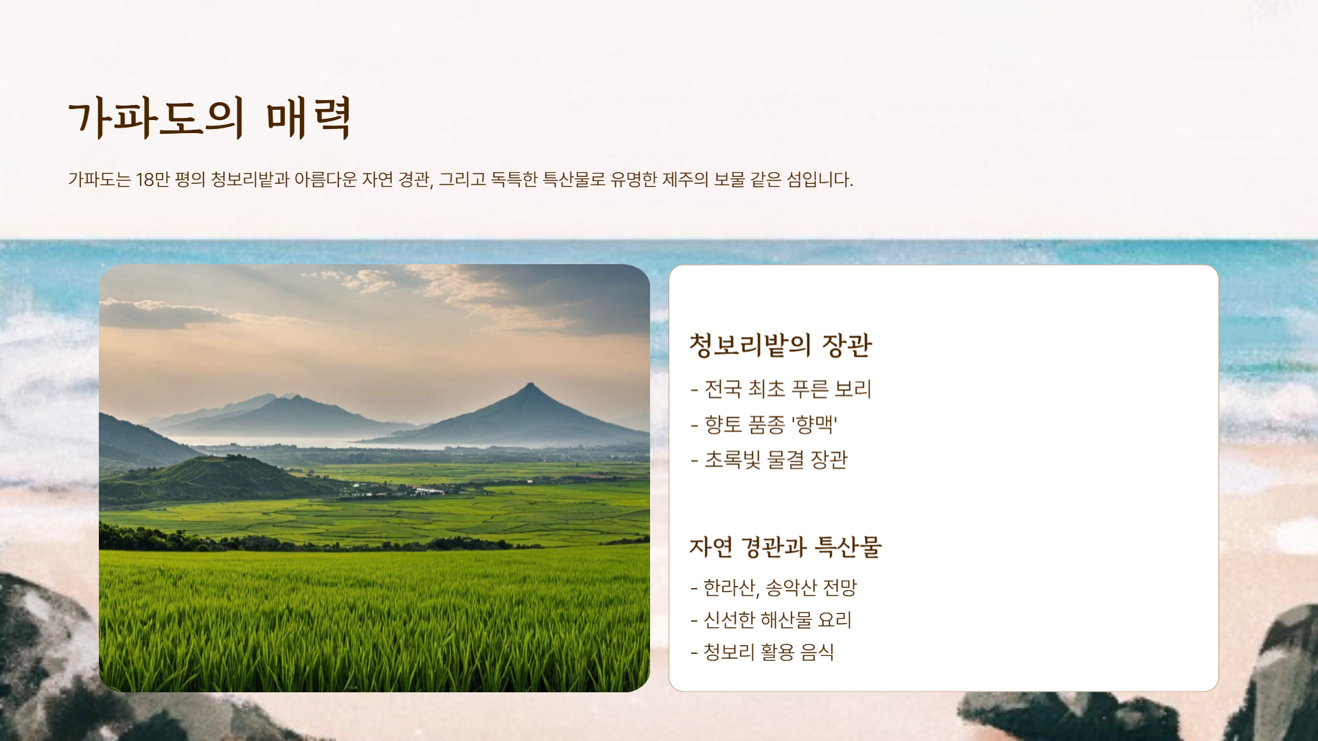 가파도 청보리축제는 제주의 봄을 온전히 느낄 수 있는 특별한 경험을 선사합니다. 초록빛 물결과 파란 하늘, 그리고 바다를 배경으로 펼쳐지는 자연의 향연은 도심 속에서 지친 이들에게 잊지 못할 추억이 되어줍니다. 특히 향맥 청보리밭과 다양한 지역 행사, 특산물 판매 등은 여행의 만족도를 높이며 가족, 연인, 친구와 함께라면 더욱 즐거운 시간이 될 것입니다. 자연을 사랑하는 분이라면 이번 봄, 가파도 청보리축제를 놓치지 마세요.