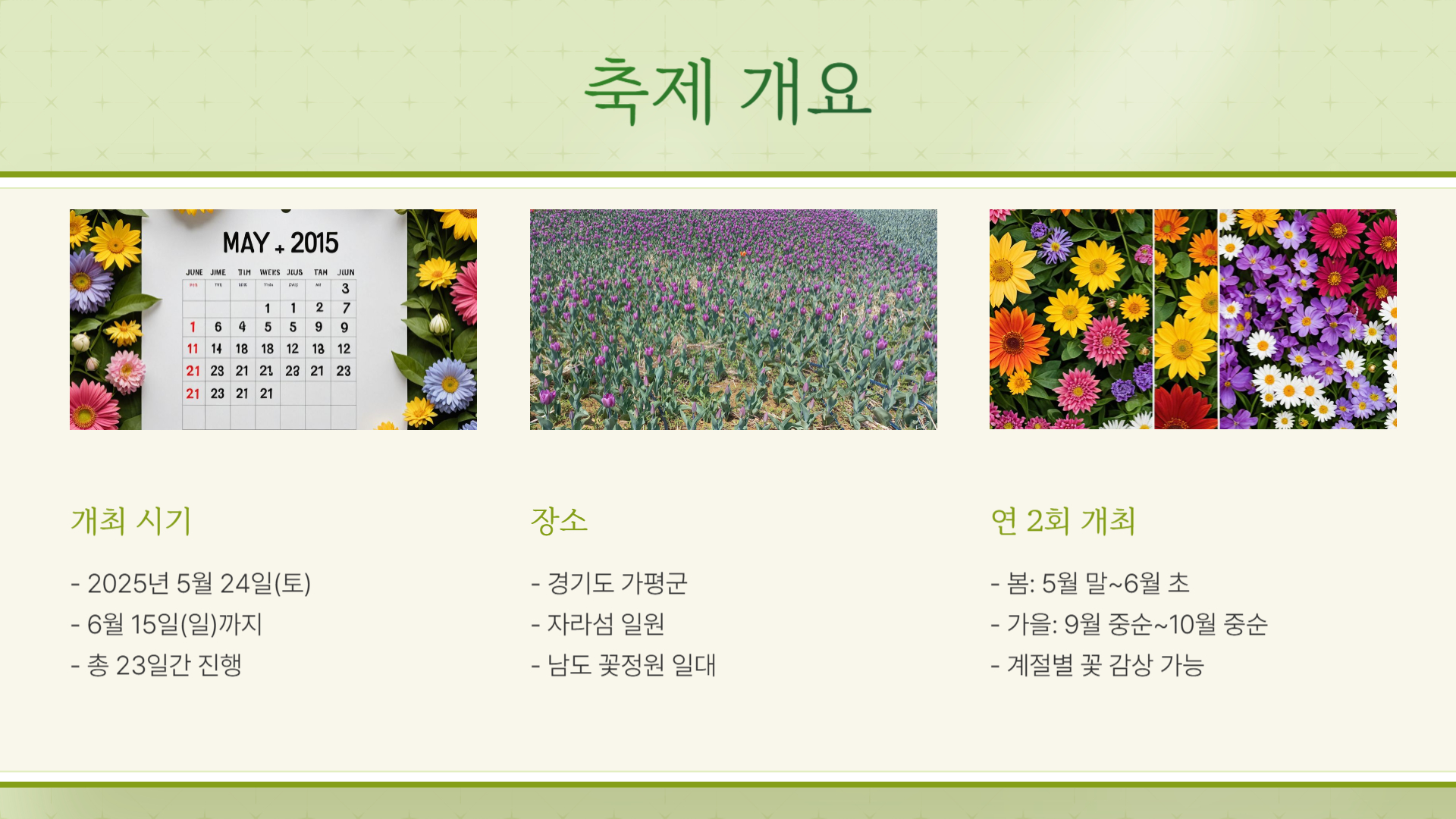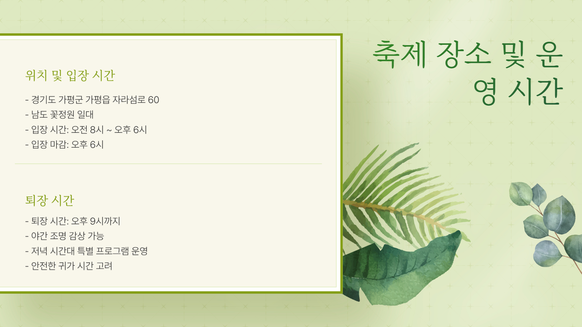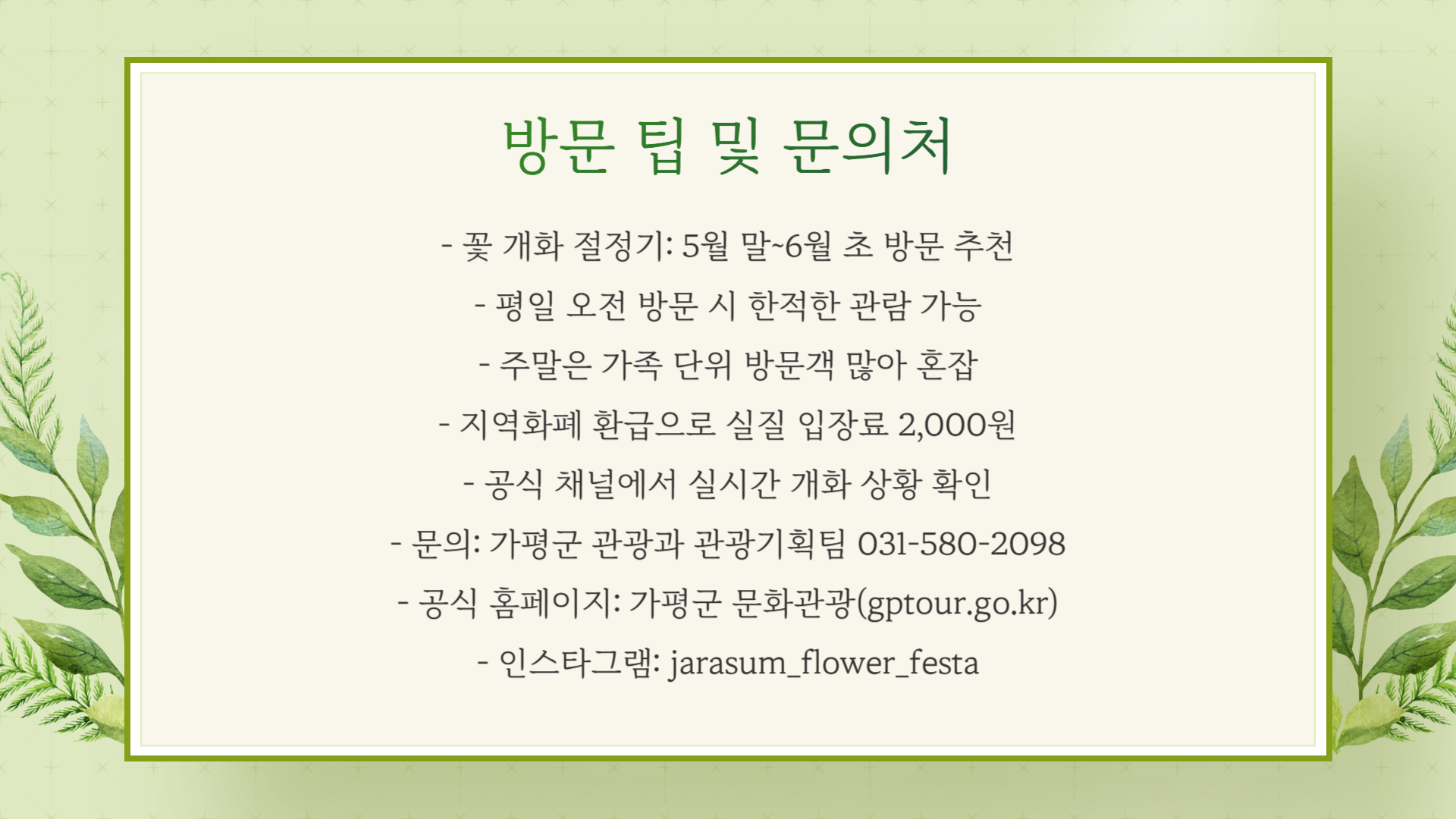 - 공식 홈페이지(gptour.go.kr)와 인스타그램(@jarasum_flower_festa)에서 실시간 정보 확인 가능!