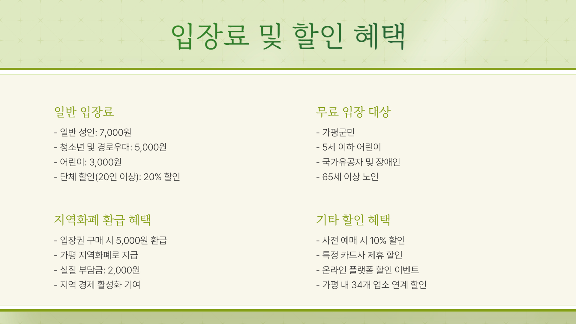 | 연계 할인 | 가평 내 음식점·카페 등 34개 업소 할인 혜택 |