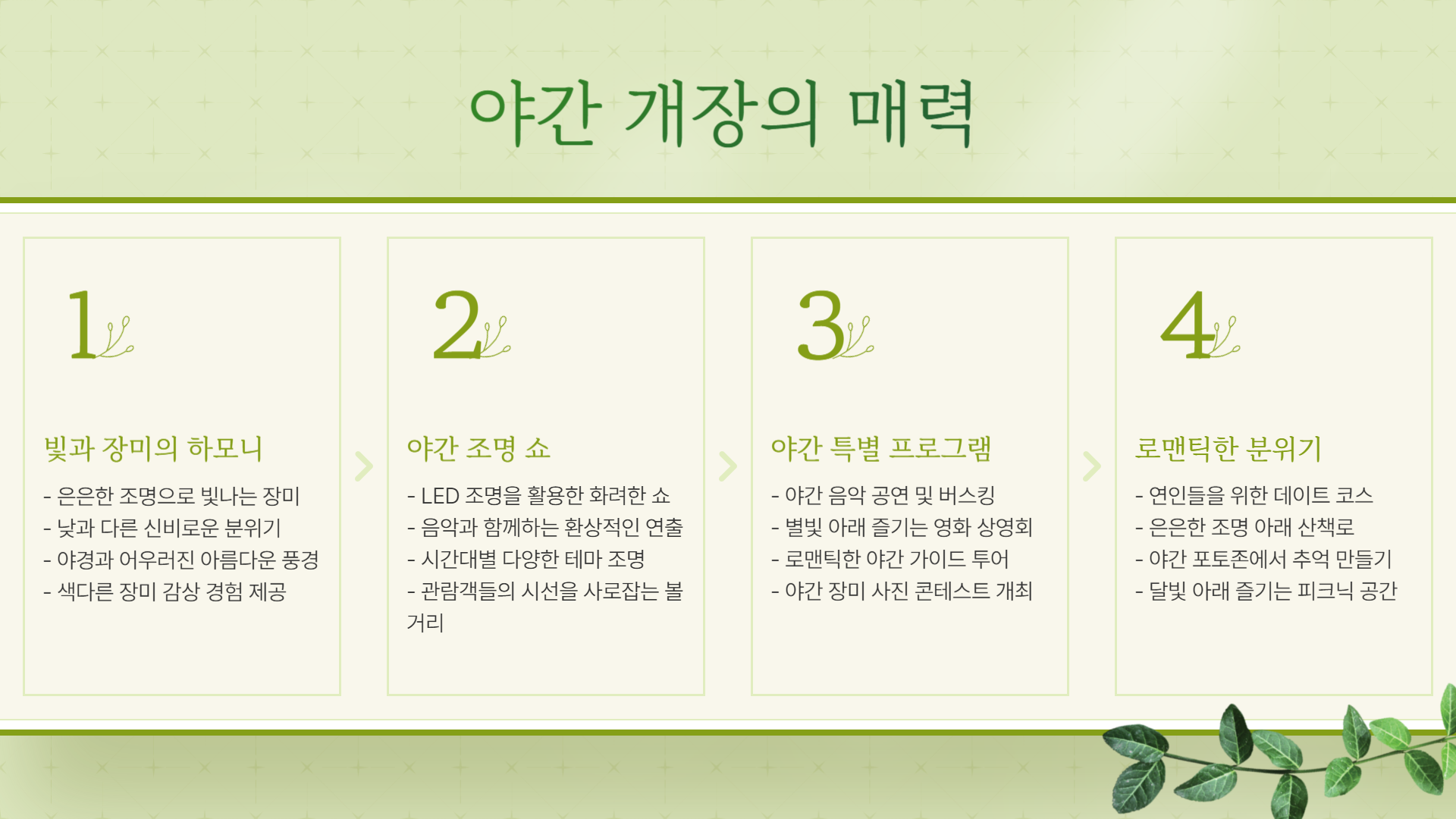 - 낮과 밤 모두 방문해 다양한 장미 정원의 매력을 만끽하세요.