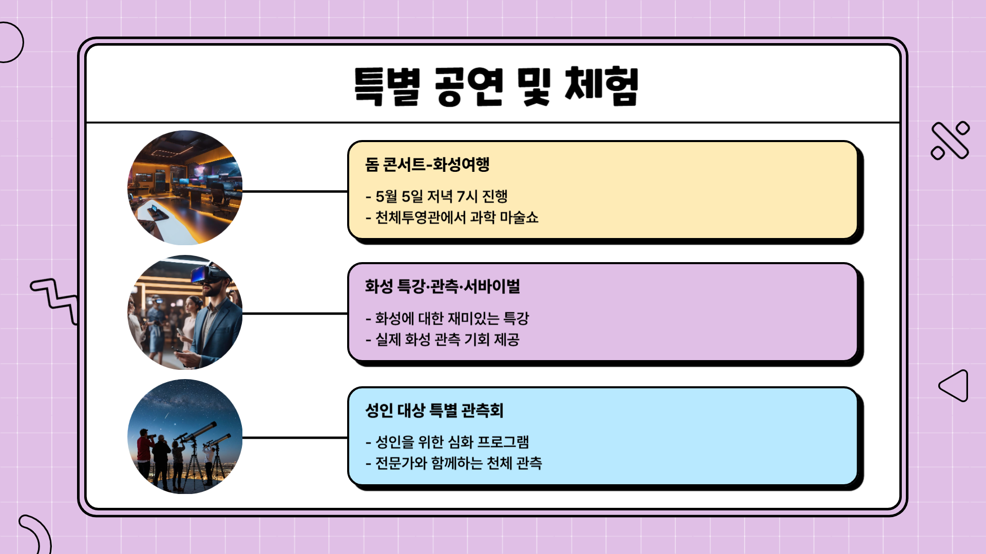 - 돔 콘서트 – 화성여행: 천체투영관, 과학 마술 형식 / 5월 5일 저녁 7시 / 사전예약자 전용