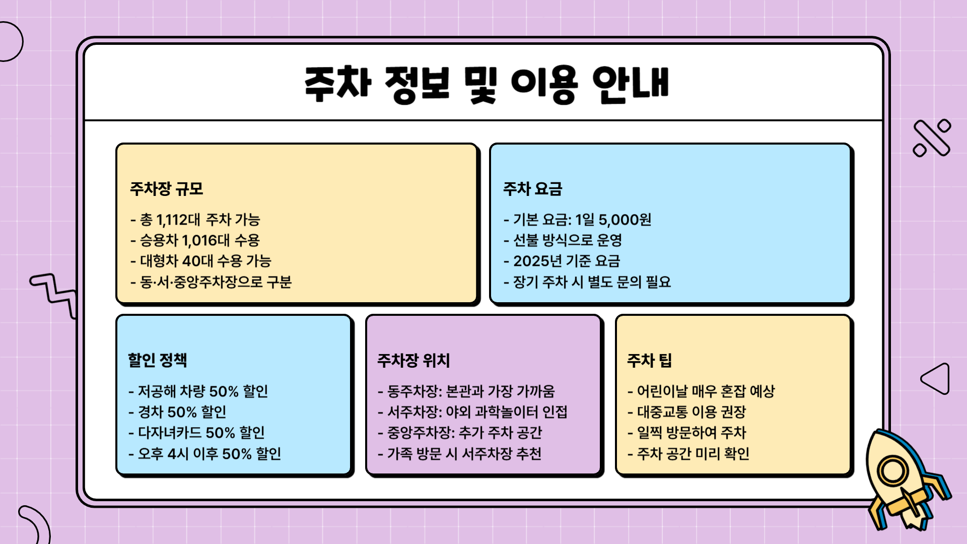 - 주차요금: 1일 5,000원(선불), 저공해차/경차/다자녀카드 50% 할인