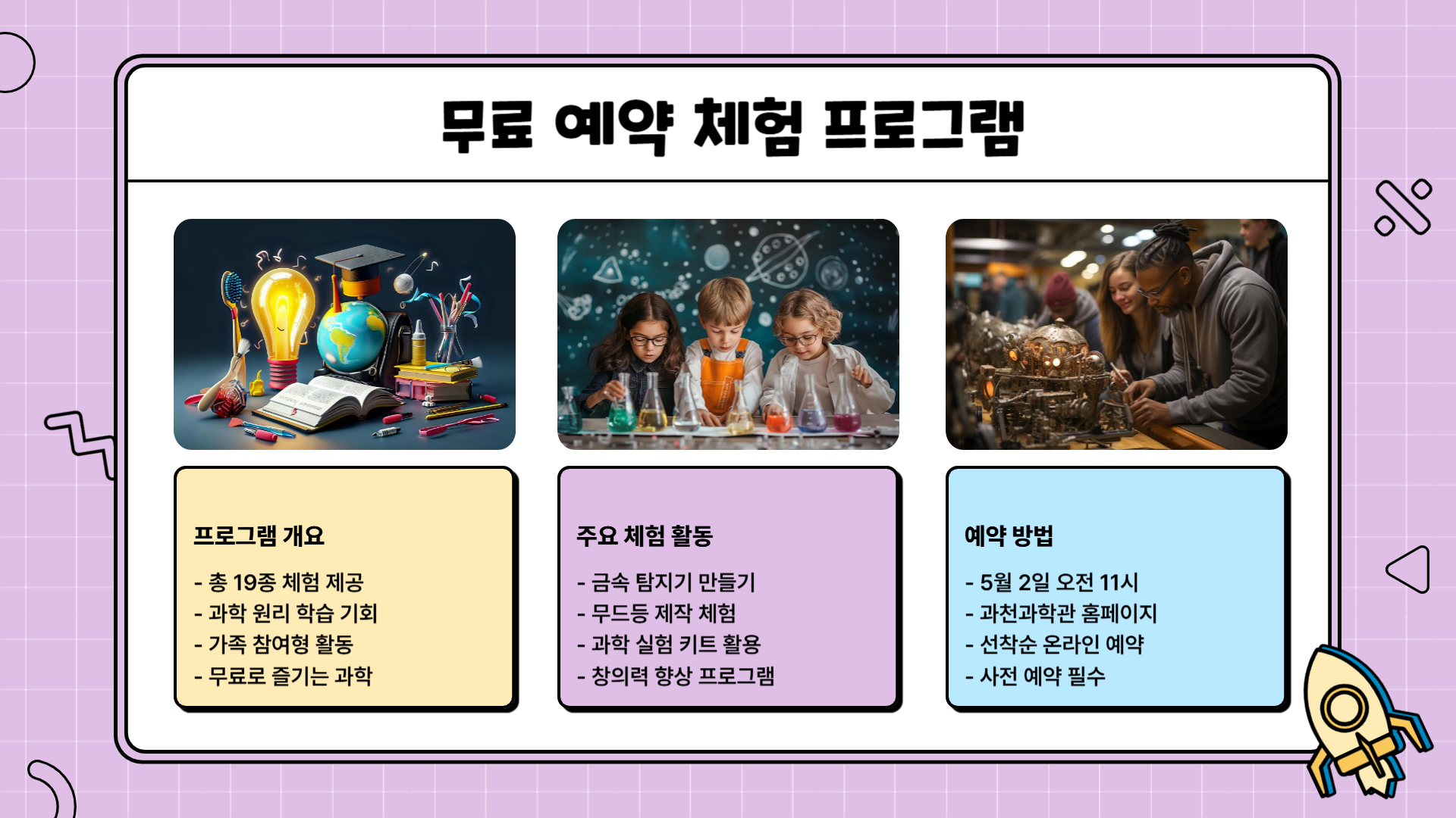 A1. 2025년 5월 2일(금) 오전 11시부터 과천과학관 홈페이지에서 가능합니다. 인기가 많은 체험은 조기 마감되므로 빠른 예약이 필요합니다.