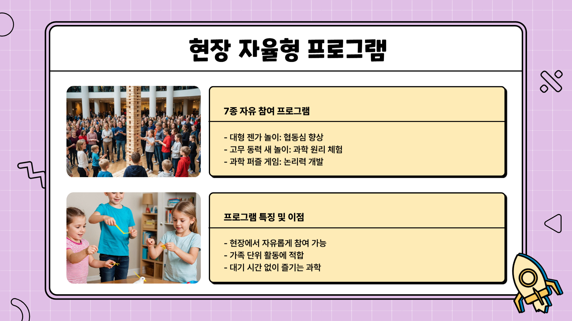 예약 없이 자유롭게 참여 가능한 과학 체험 활동으로, 아이들이 자연스럽게 과학을 접할 수 있도록 구성되어 있습니다.