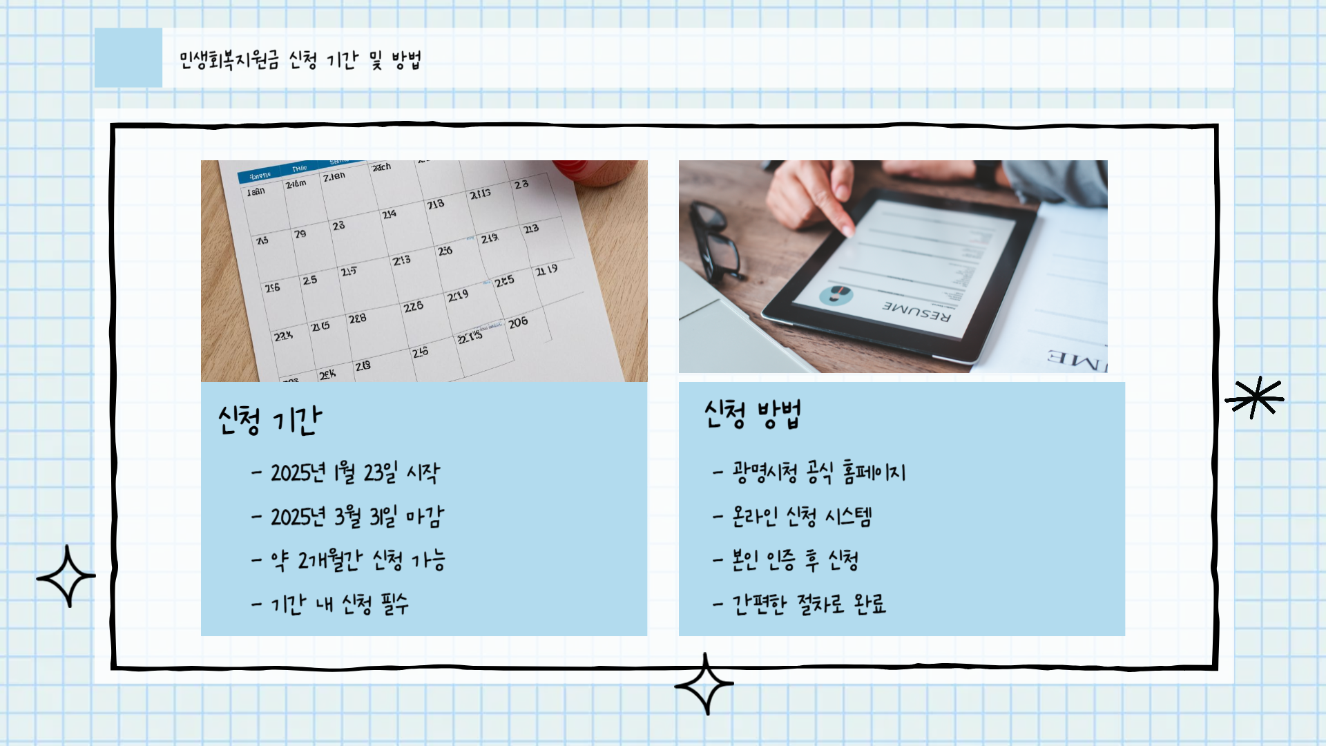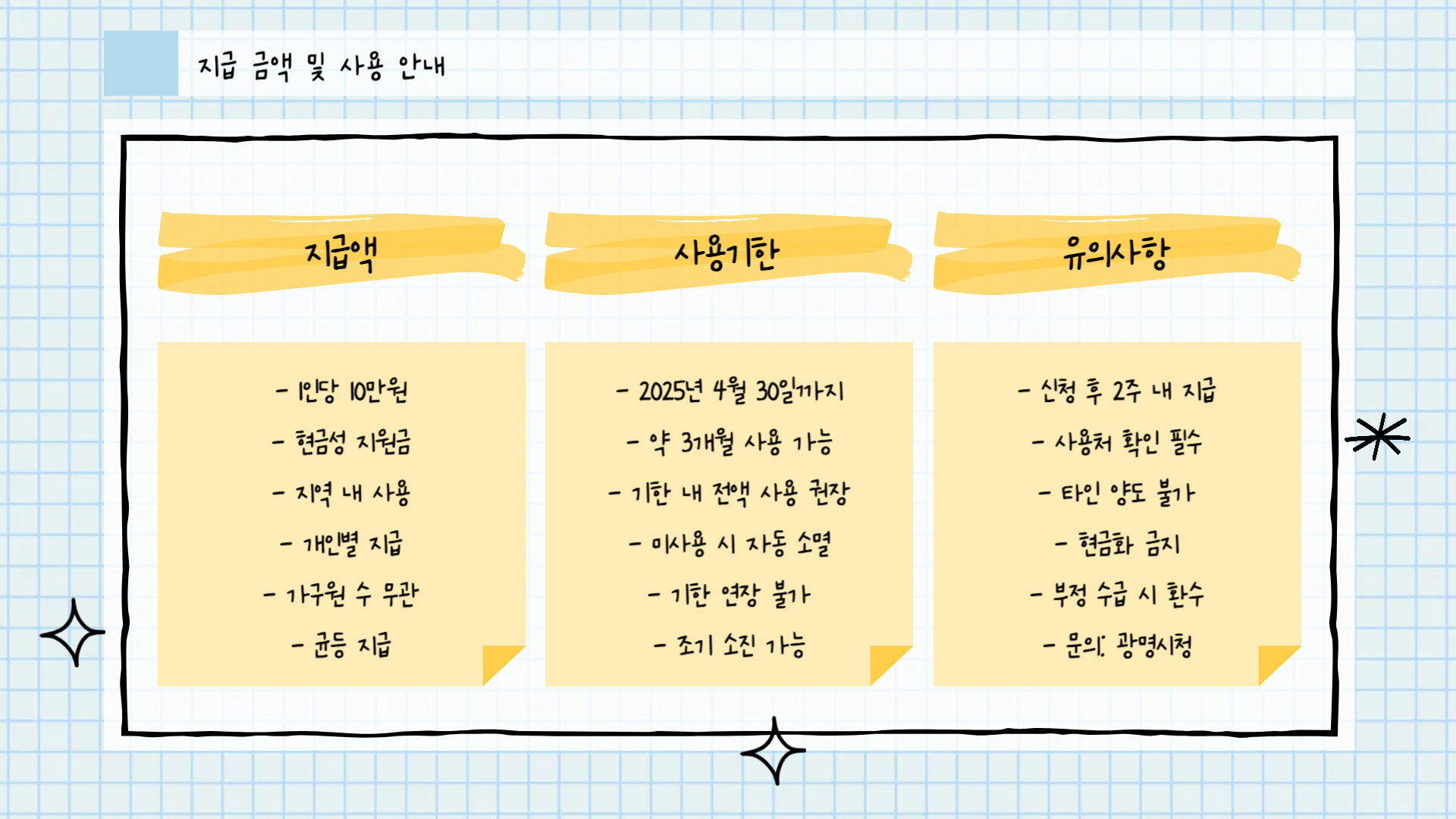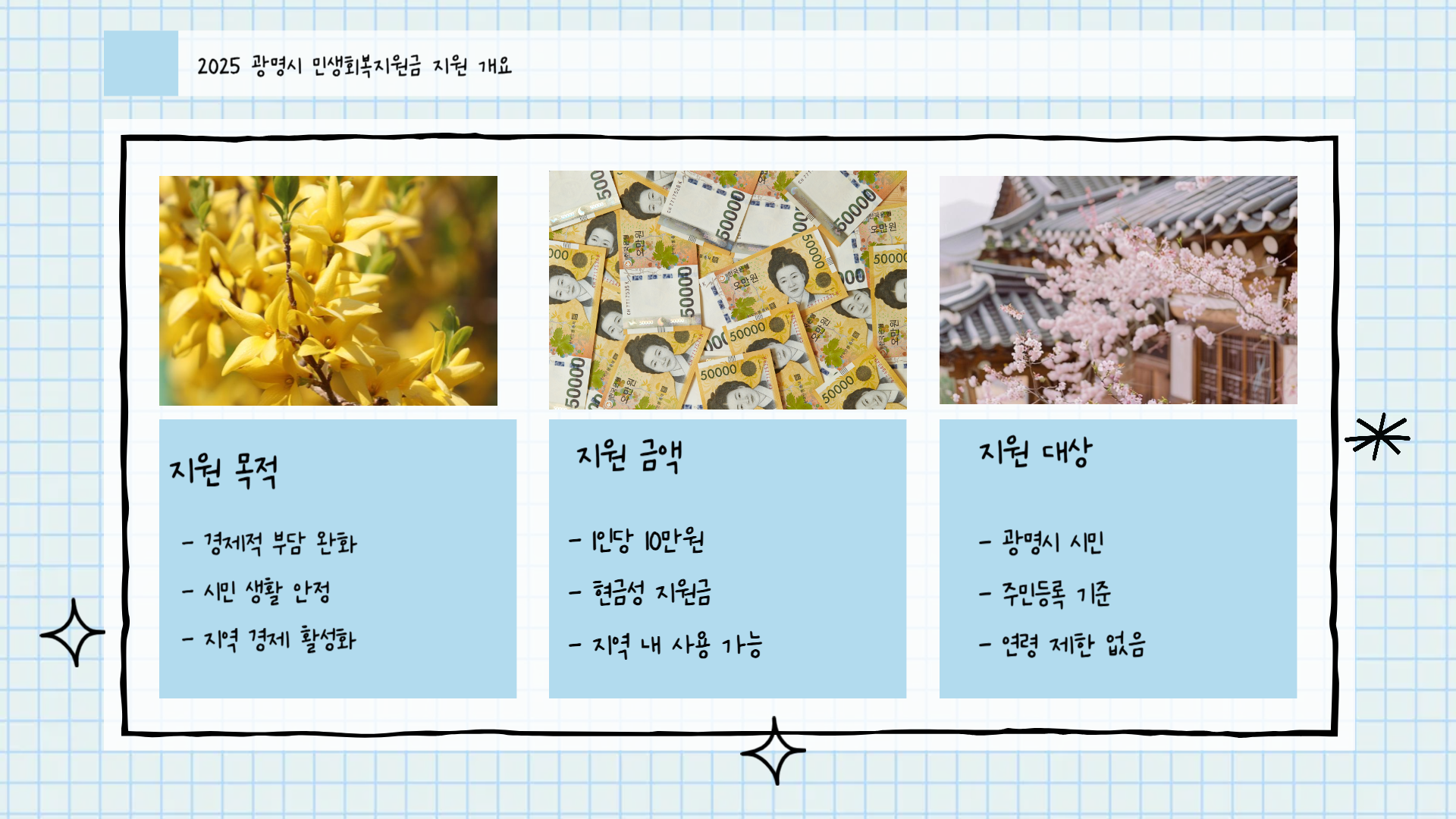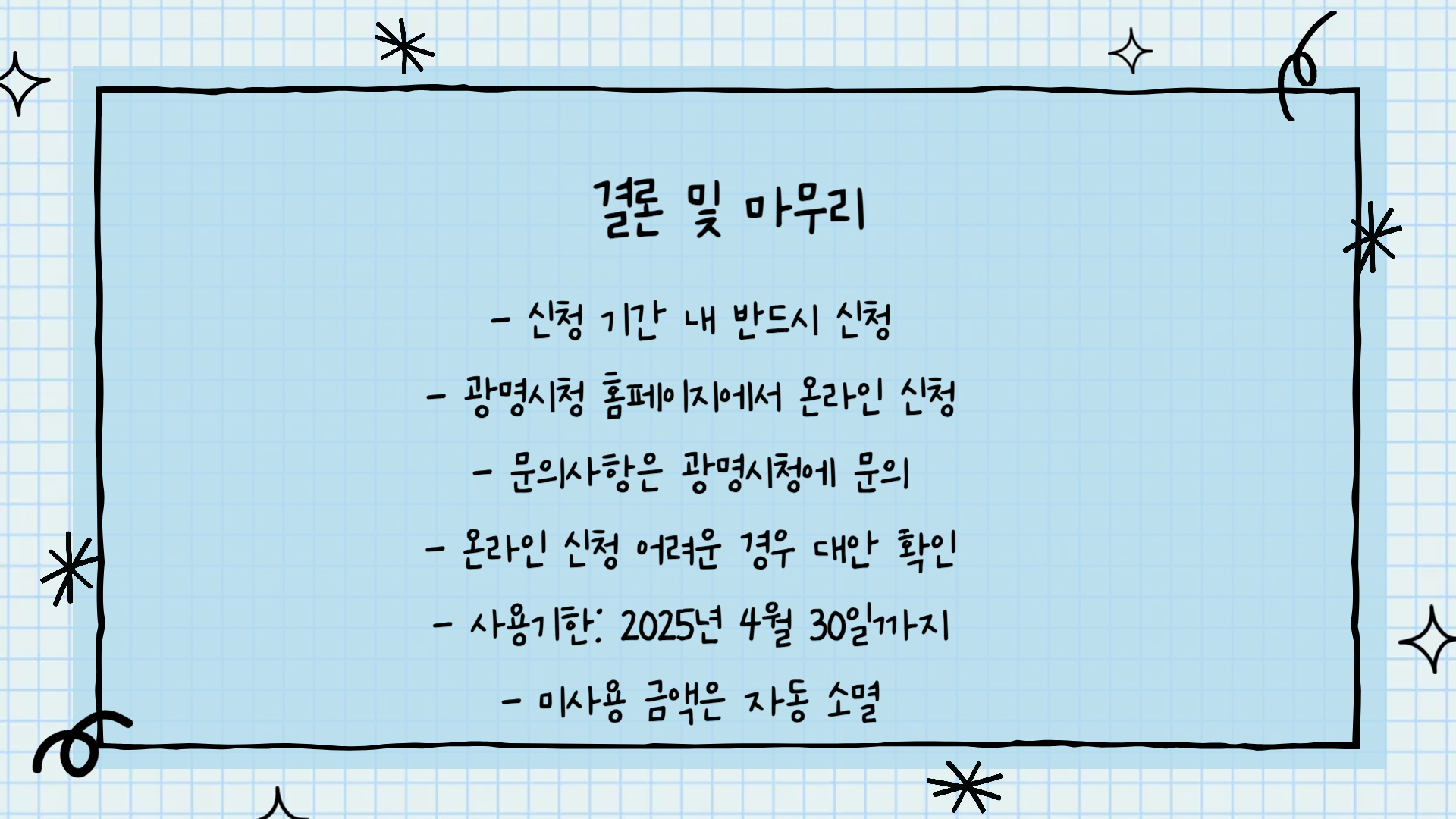 📌 2025 광명시 민생회복지원금은 시민들의 경제적 부담을 덜어주기 위한 지원책입니다. 신청 기한을 놓치지 않도록 서둘러 신청하세요!