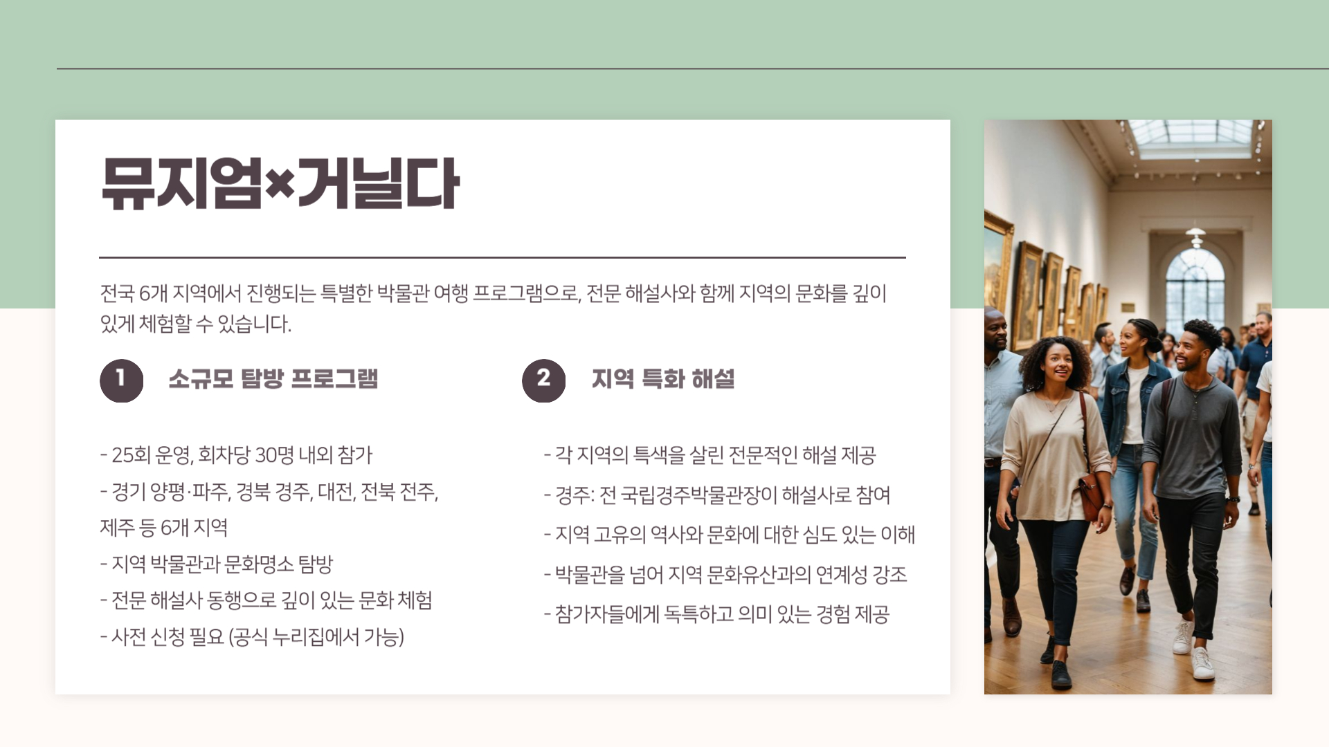 ‘뮤지엄×거닐다’는 지역 문화명소와 박물관을 함께 둘러보는 소규모 문화탐방 프로그램입니다. 경기 양평, 파주, 경북 경주, 대전, 전주, 제주 등 6개 지역에서 25차례에 걸쳐 탐방단이 운영되며, 지역 전문 해설사가 동행하여 보다 깊이 있는 해설을 제공합니다.