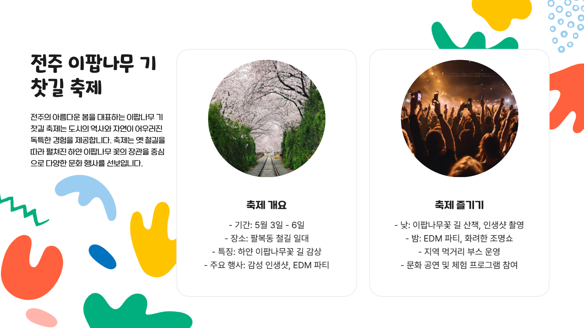 전주의 숨은 봄 명소, 팔복동 이팝나무 철길에서 5월 3일부터 6일까지 축제가 열려요. 🌸 낮에는 만개한 이팝나무꽃을, 밤에는 경관 조명이 더해진 환상적인 풍경을 감상할 수 있습니다. 기찻길을 따라 설치된 포토존과 버블쇼, 솜사탕 퍼포먼스, 심지어 EDM 파티까지! 감성 넘치는 낮과, 흥겨운 밤을 모두 즐길 수 있는 축제랍니다.
